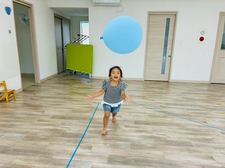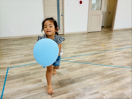 くまグループでは、瞬発力向上を目的に風船ダッシュを行いました。 「よーい、ドン!」の掛け声で職員がスタートから数メートル離れた場所で風船を落として… 床に落ちるまでの間にダッシュで風船にタッチやキャッチができれば成功です! 風船の動きをよ~く目で追いながら、お見事キャッチ★ 少しずつ難易度をあげて、スタートから風船までの距離を離すことにも挑戦しましたよ。 遠く離れた場所からもキャッチやタッチができた際は、「取れたよ♪」と得意気な声が聞かれました!