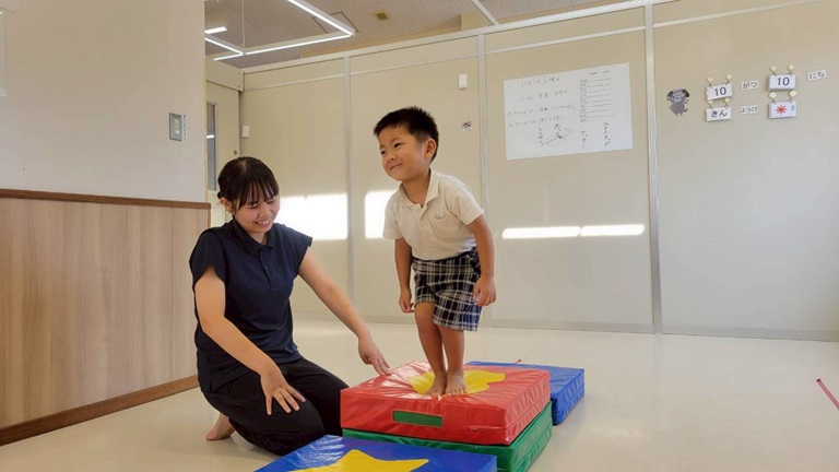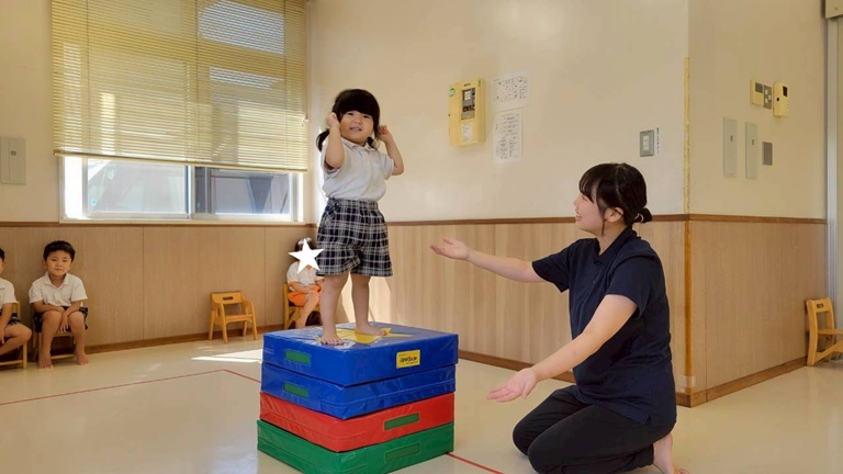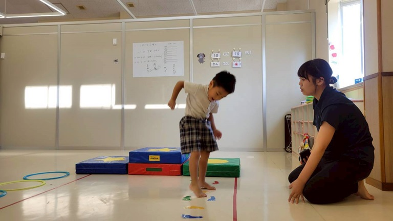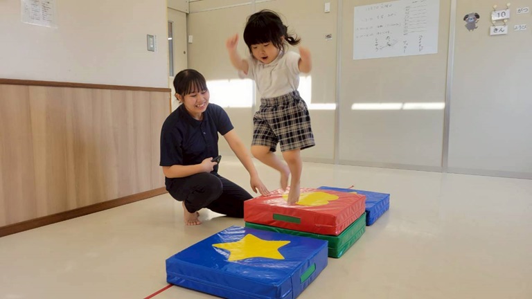 今日は、身体でバランスをとりながら、両足で跳ぶジャンプの活動をしました。 ケンケンパリングやJPマット、足跡マークの上を両足をそろえて、『ぴょん!ぴょん!』とジャンプ! 最初は、片足ずつ跳ぶ様子もありましたが、職員と手をつないだり、一緒にタイミングを合わせて声を掛けたりすることで、少しずつ両足で跳べるようになってきました。 最後は、JPマットを積み重ねた所から、大きく跳ぶことに挑戦しました。 「もう1回する!」と時間いっぱい何度も挑戦するくまグループさんでしたよ♪