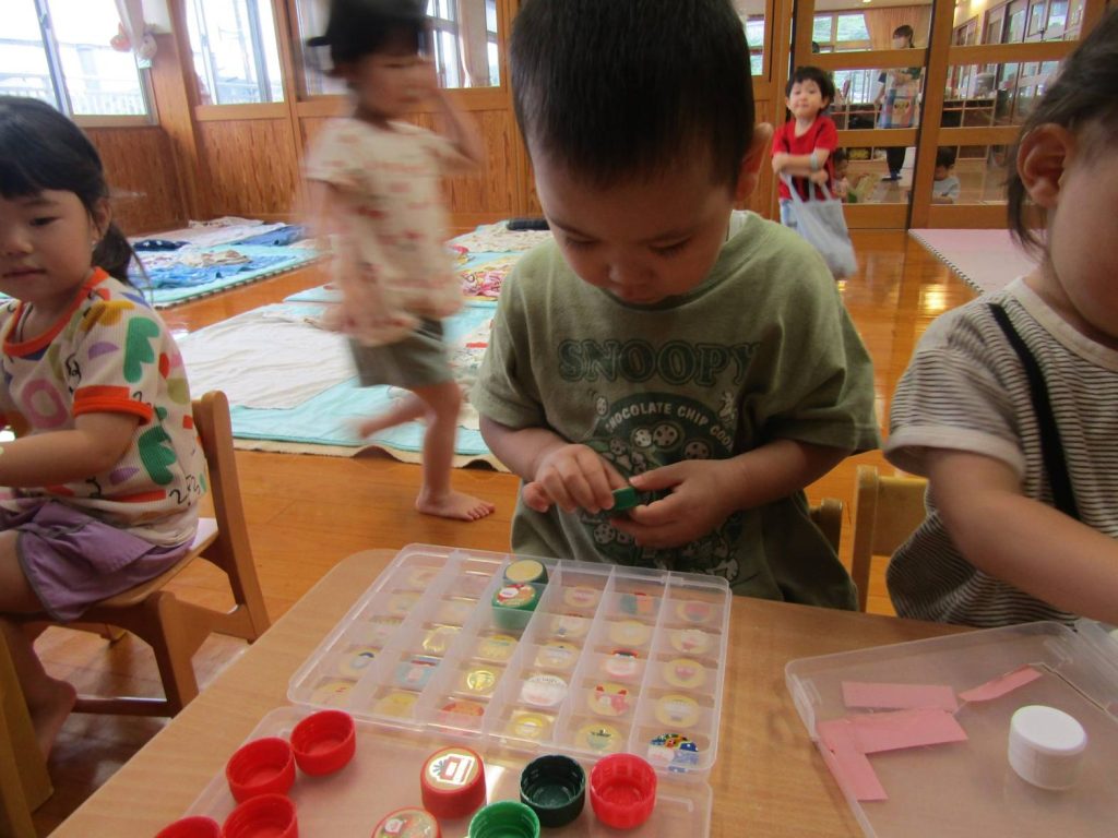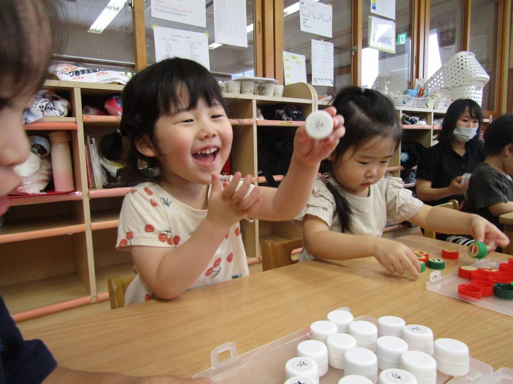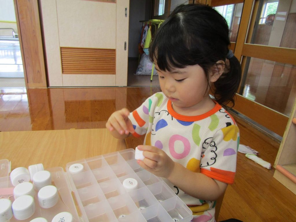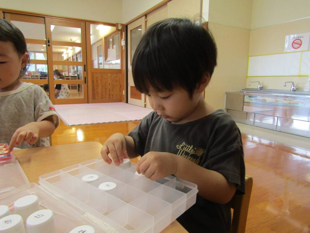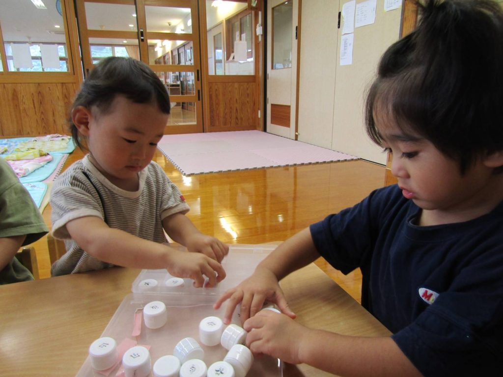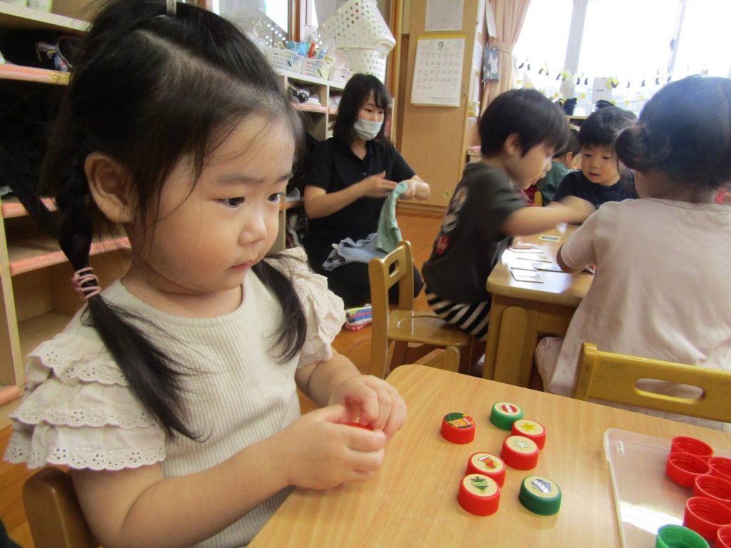 最近は机上遊びを楽しむ時間が増えています。 絵を見て、同じ絵が描いているところにはめる遊びでは、みんな真剣な表情で取り組む子ともたち。 ピッタリはまると「できたー!」と嬉しそうに見せてくれたり、「一緒にしよう!」、「ここだよ!」と友だち同士で協力するぱんだ組さん。 完成しては戻してを繰り返し楽しんでいます。 これからも机上遊びを通して集中して取組むことや、達成感を味わうことのできる遊びを取り入れたいと思います。