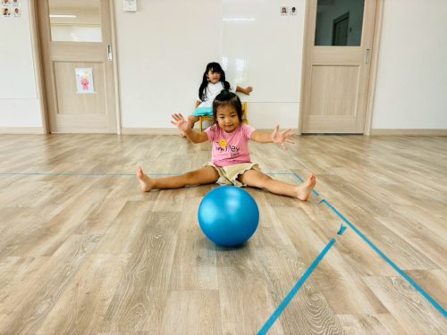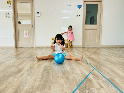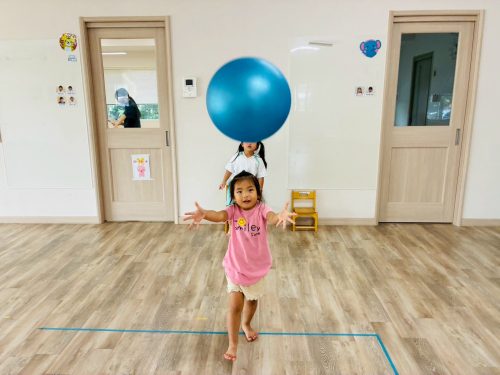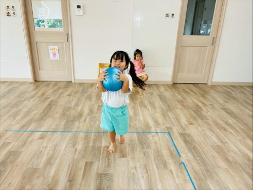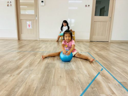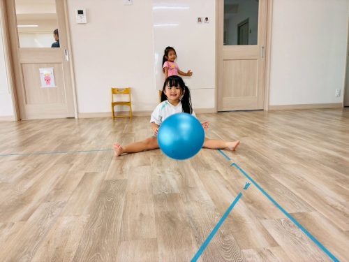 最初は、床に座って足を広げた状態で職員と向かい合い、ボールを転がしてラリーをします!