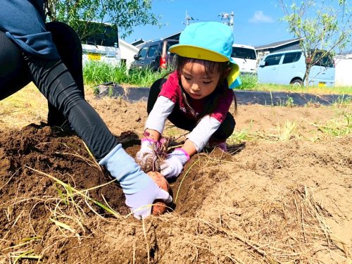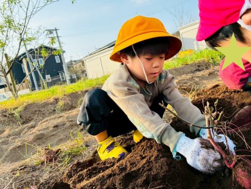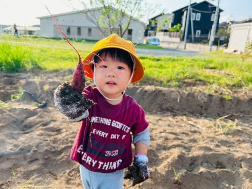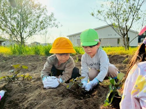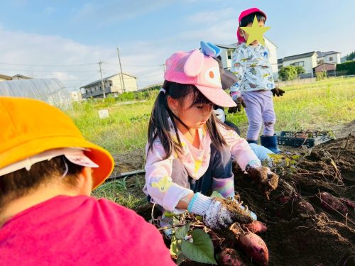 サツマイモの周りの土を力いっぱい掘ると、職員やお友だちと協力して慎重にお芋を引き抜くことができました!