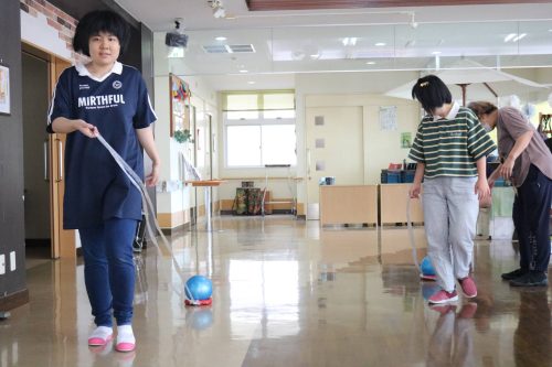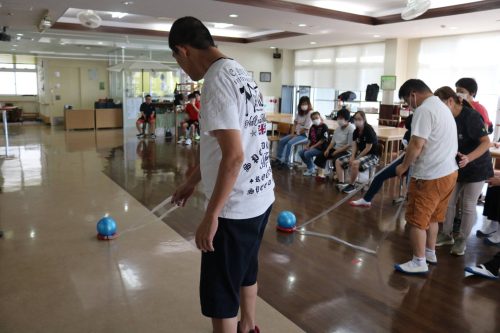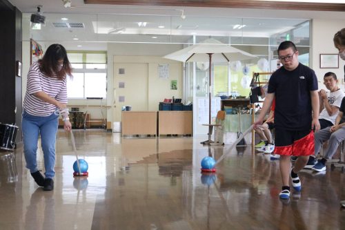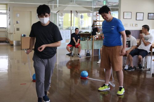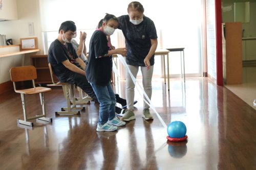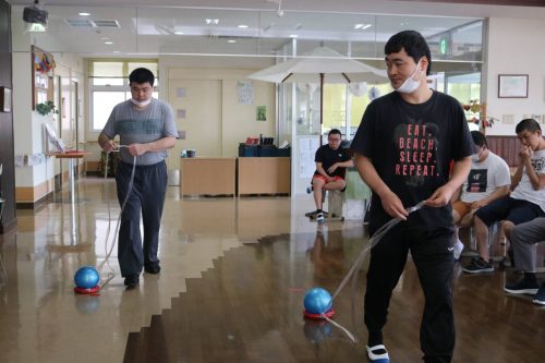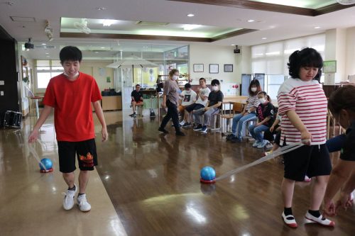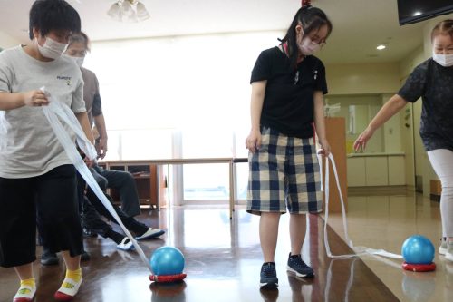 リハレクにてボールを使ったレクリエーションを行いました。 紐のついた輪っかにボールを乗せ、落とさないよう 皆さん慎重に楽しまれているご様子でした。 しっかりルールを守りながら 時間いっぱい挑戦していました。