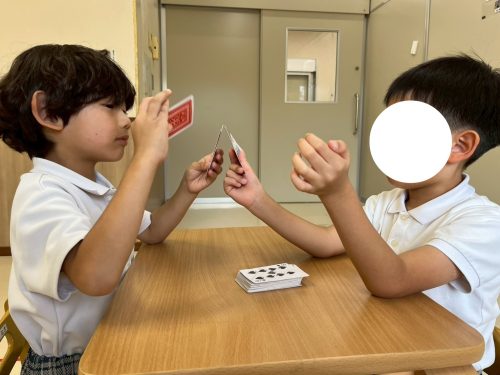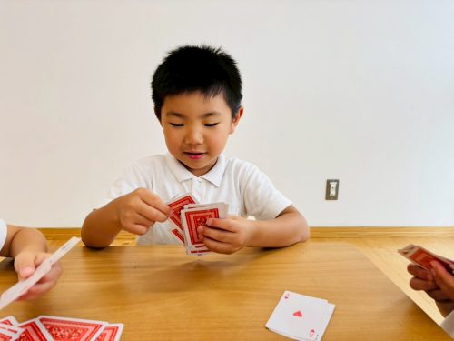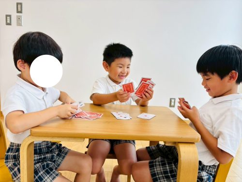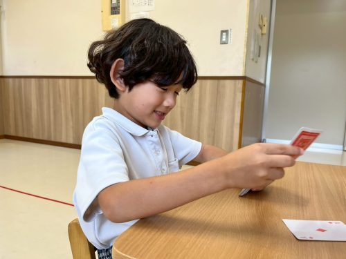 今回、ぞうグループでは、トランプの活動でババ抜きを行いました。 集中力の向上やルールを理解することを目的として取り組んでいます。 初めて行う活動だったため、まずは、職員と一緒にルールの確認をしていきます。 慣れてくると、手札から同じ数字を見つけて出すのも早くなったり、職員の声掛けなしで取り組むことが出来ています。 ババを持っているけど、「持ってないよ。」と言ってみたり、無表情を取り繕ったりなど、ゲームに勝つための工夫を自分なりに考えて取り組むぞうグループさんでした♪
