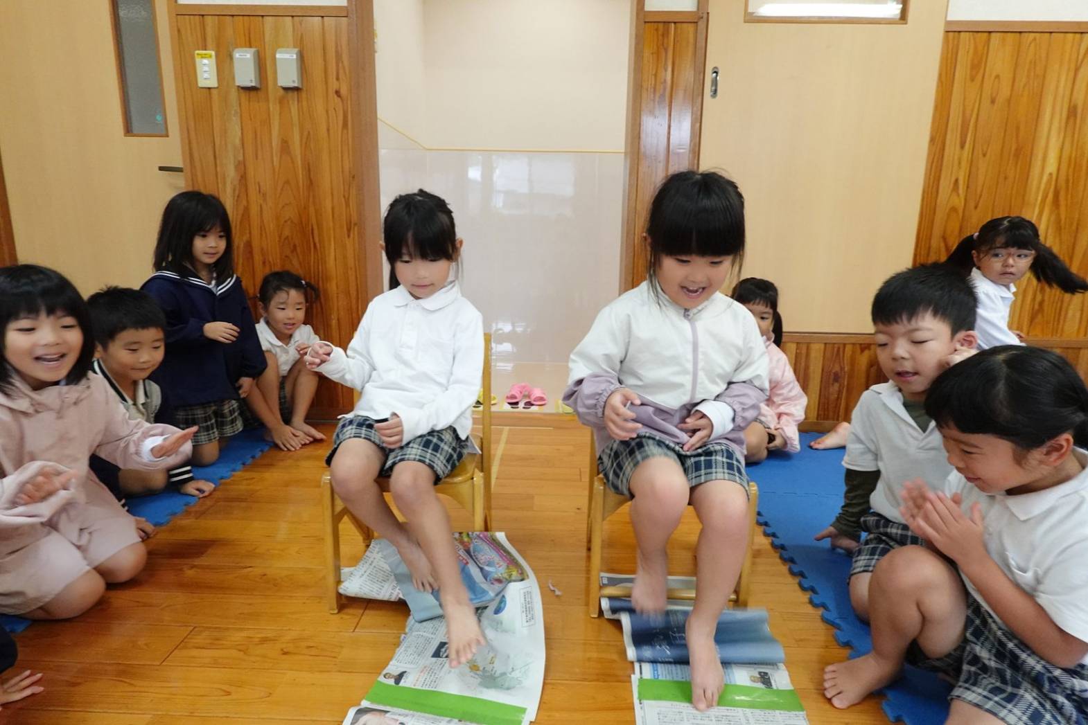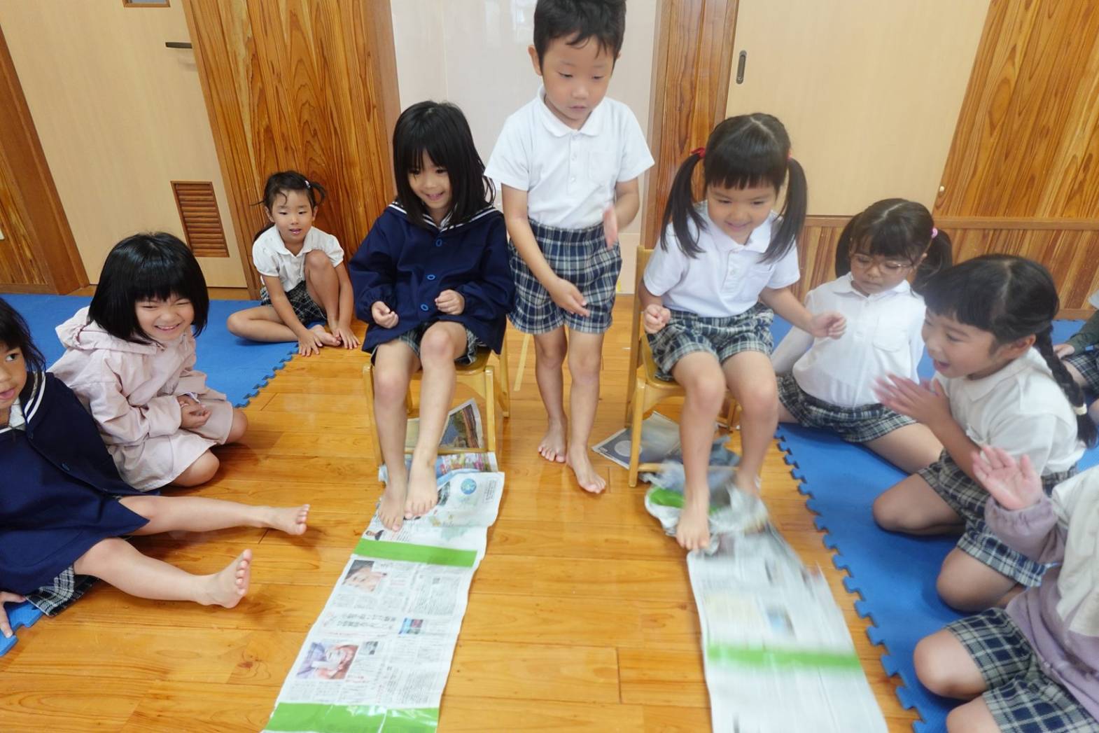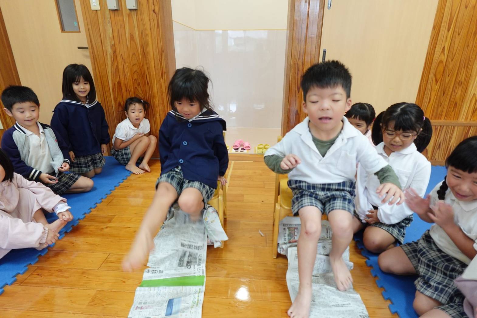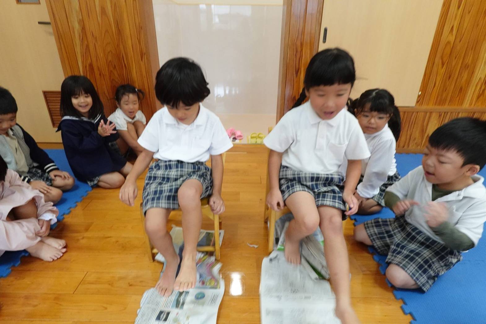 今日は、長く繋げた新聞紙を足だけで巻き取る競争をしました。 長く繋げた新聞紙と、椅子を準備すると「何するんだろう?」「これ見たことあるかも!」と興味津々の子どもたち。 緑チームと黄色チームに分かれていよいよゲームスタート! 「頑張れ!」「〇〇ちゃん早い!」と競争に全力の子どもたち。 結果は緑チームの勝ちでしたが、活動が終わってからも「一緒にしよう!」とお友だちを誘って遊ぶ姿が見られました♫