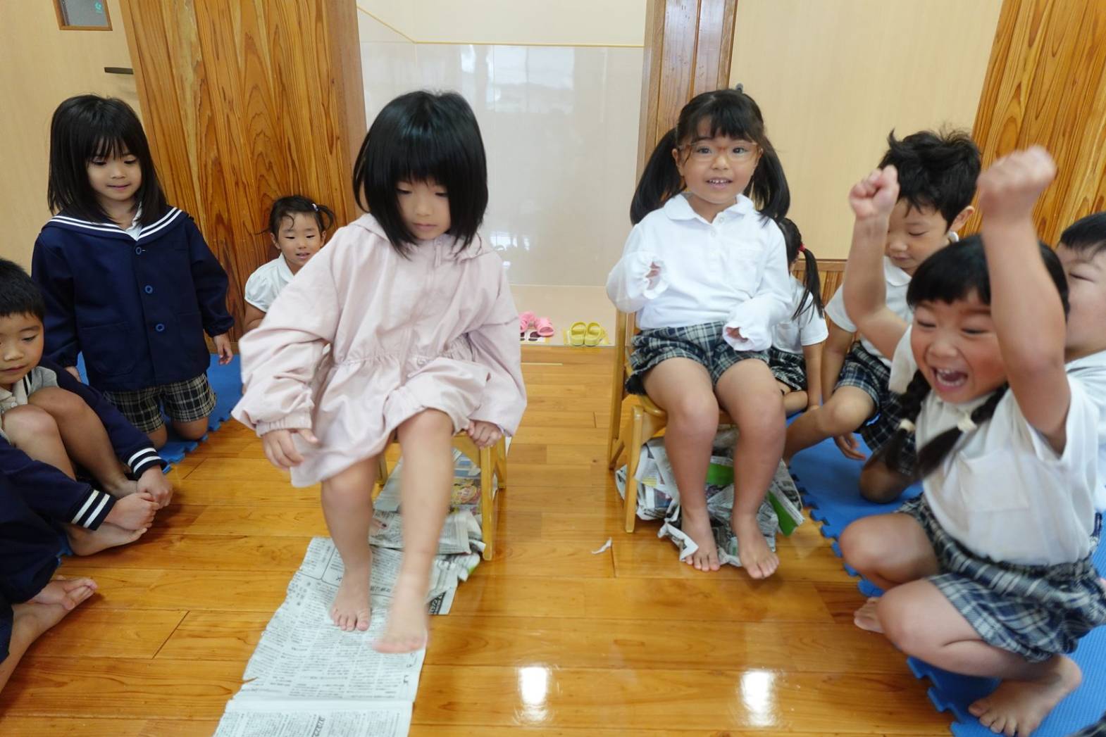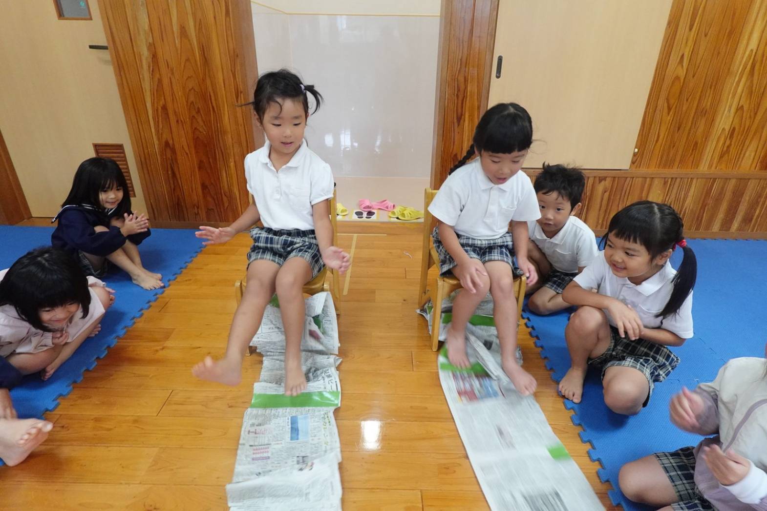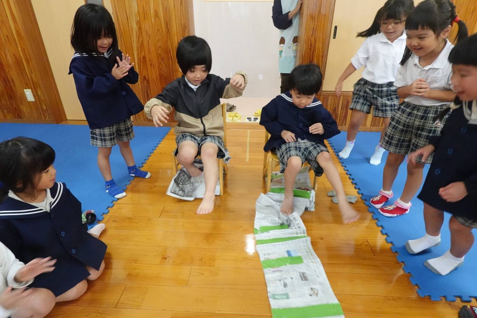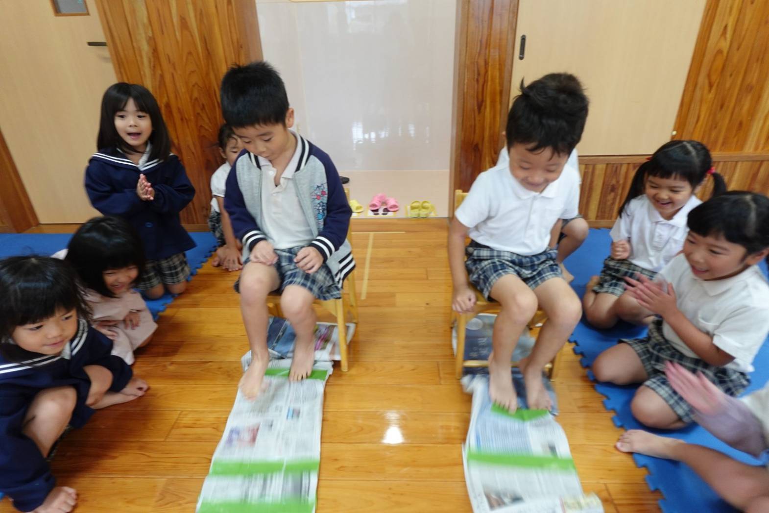 今日は、長く繋げた新聞紙を足だけで巻き取る競争をしました。 長く繋げた新聞紙と、椅子を準備すると「何するんだろう?」「これ見たことあるかも!」と興味津々の子どもたち。 緑チームと黄色チームに分かれていよいよゲームスタート! 「頑張れ!」「〇〇ちゃん早い!」と競争に全力の子どもたち。 結果は緑チームの勝ちでしたが、活動が終わってからも「一緒にしよう!」とお友だちを誘って遊ぶ姿が見られました♫
