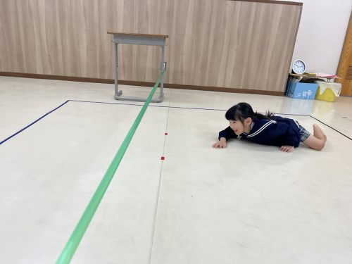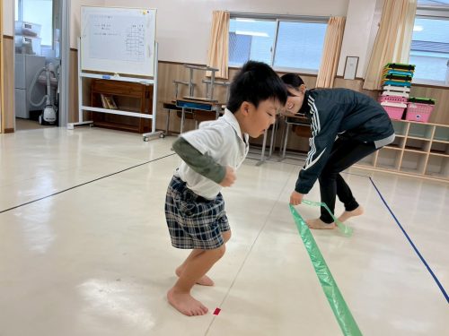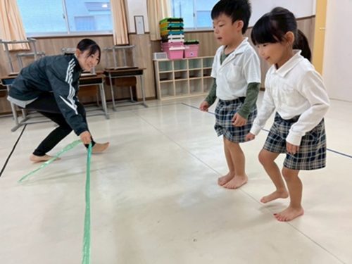 職員が、すずらんテープを足元に動かした際には、ジャンプで避けたり、子どもたちのお腹くらいにすずらんテープがきた際は、しゃがみこんで避けたりしています。