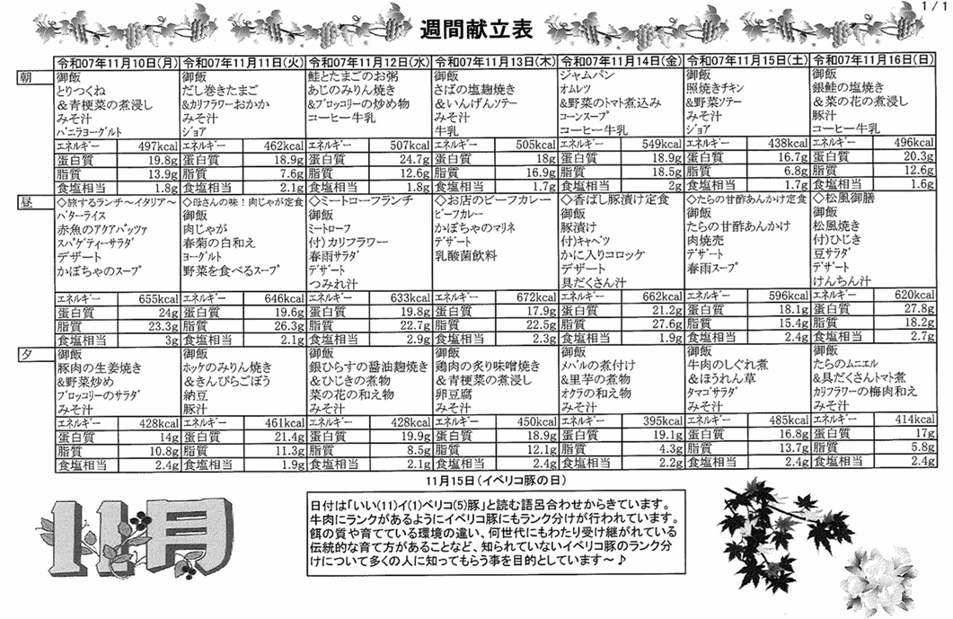 11月10日(月)~11月16日(日)の献立表になります。ぜひご覧ください。