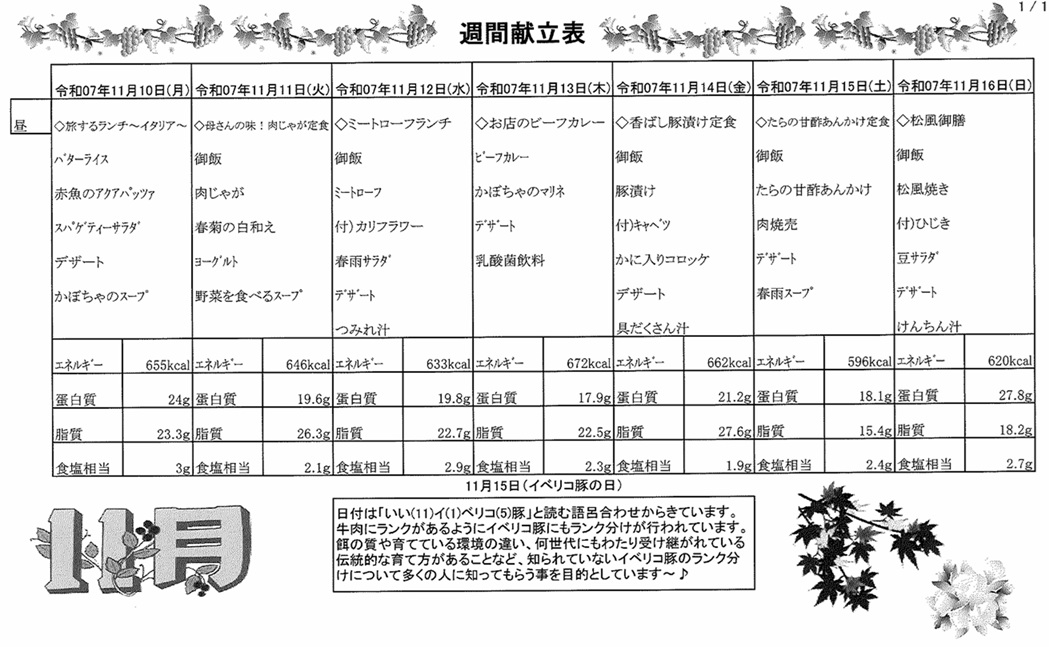 11月10日(月)~11月16日(日)の献立表になります。ぜひご覧ください。