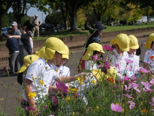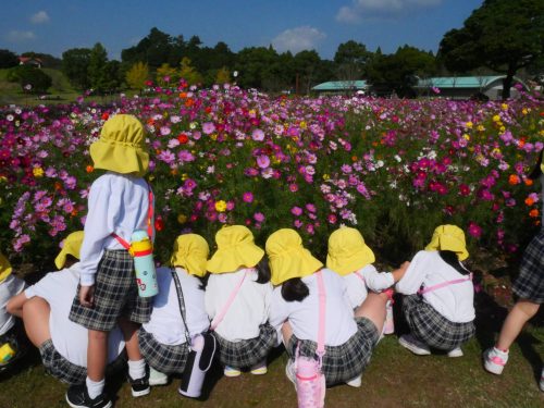 都市農業センターにコスモスを見に行きました。 コスモスを見た瞬間、「すごく綺麗!」「いっぱい咲いてる!」と大興奮のきりん組さん。 コスモスに顔を近付けて匂いを嗅いだり、虫の観察をしたりして楽しむ姿が見られます。 「私は、ピンクのコスモスが好きだな!」「あっちのコスモスも見に行こうよ!」と、友だちと会話を楽しむ子どもたち。 「次の季節は何の花が咲くのかな?」「家に帰ったら綺麗だったよって教えてあげよう!」と、満足そうな様子のきりん組さんです。