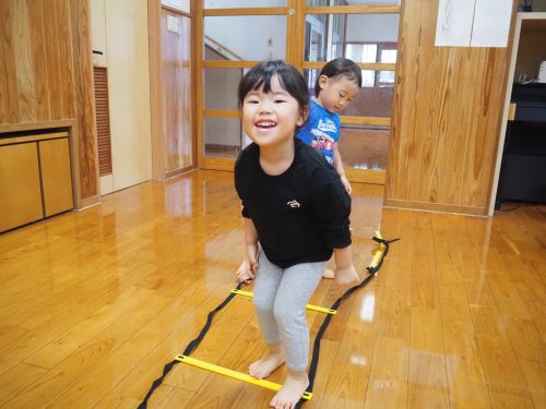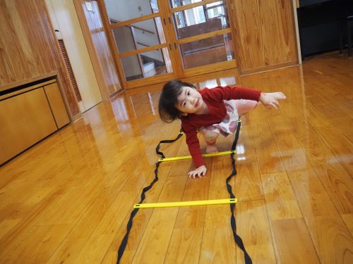 ジャンプに慣れてくると、動物の真似をしながら通ってみたり、黄色の棒の間を走って通ったりと子どもたちからたくさん遊びの展開が見られました。
