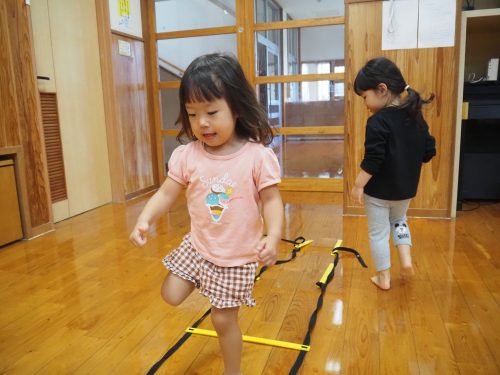 大きい組さんにあるラダーを使ってみると、始めの頃は黄色の部分を踏んで通っていた子どもたち。