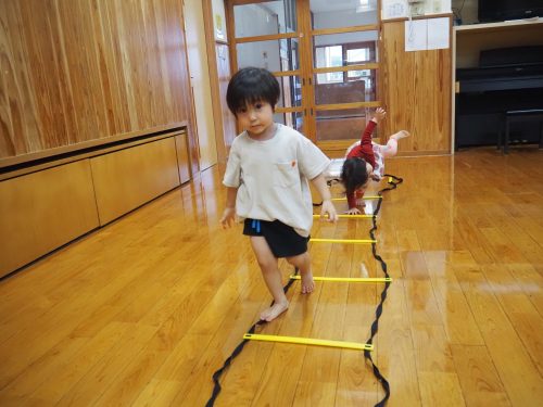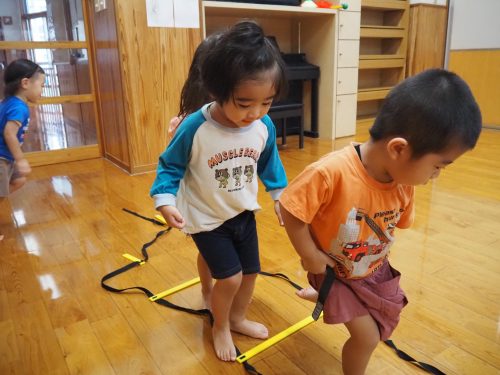 ジャンプに慣れてくると、動物の真似をしながら通ってみたり、黄色の棒の間を走って通ったりと子どもたちからたくさん遊びの展開が見られました。