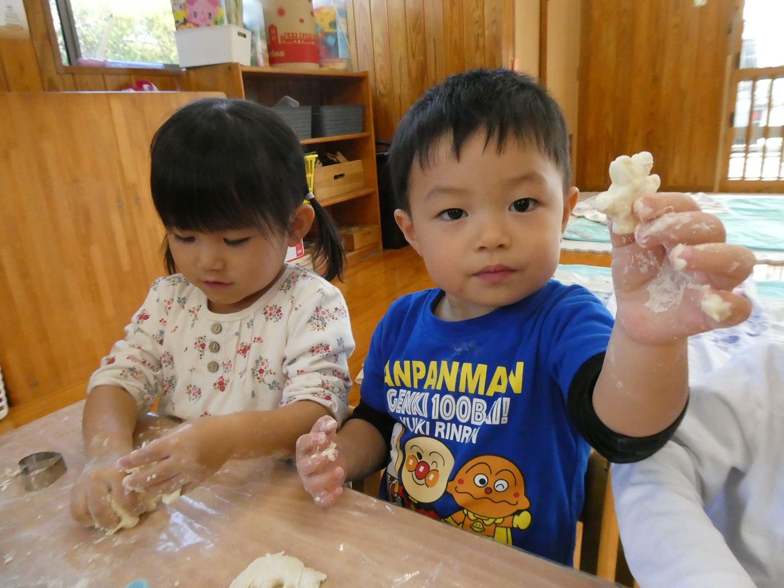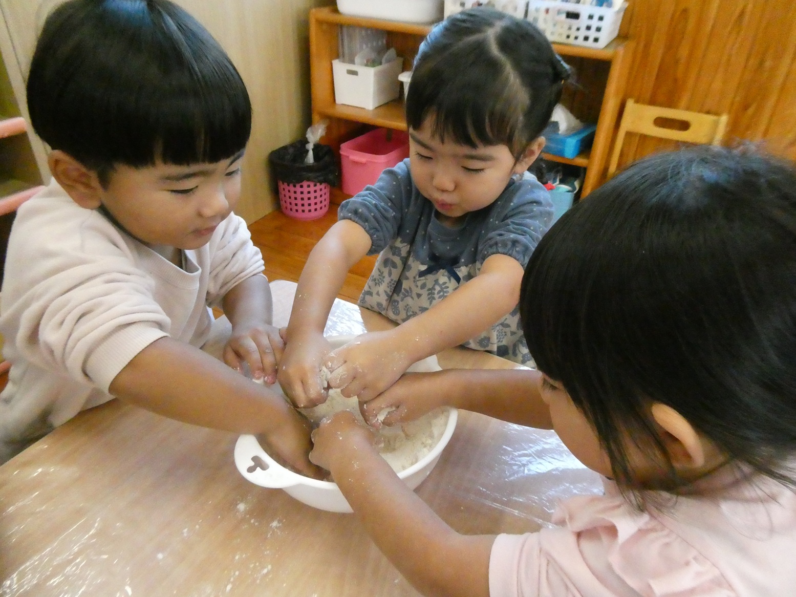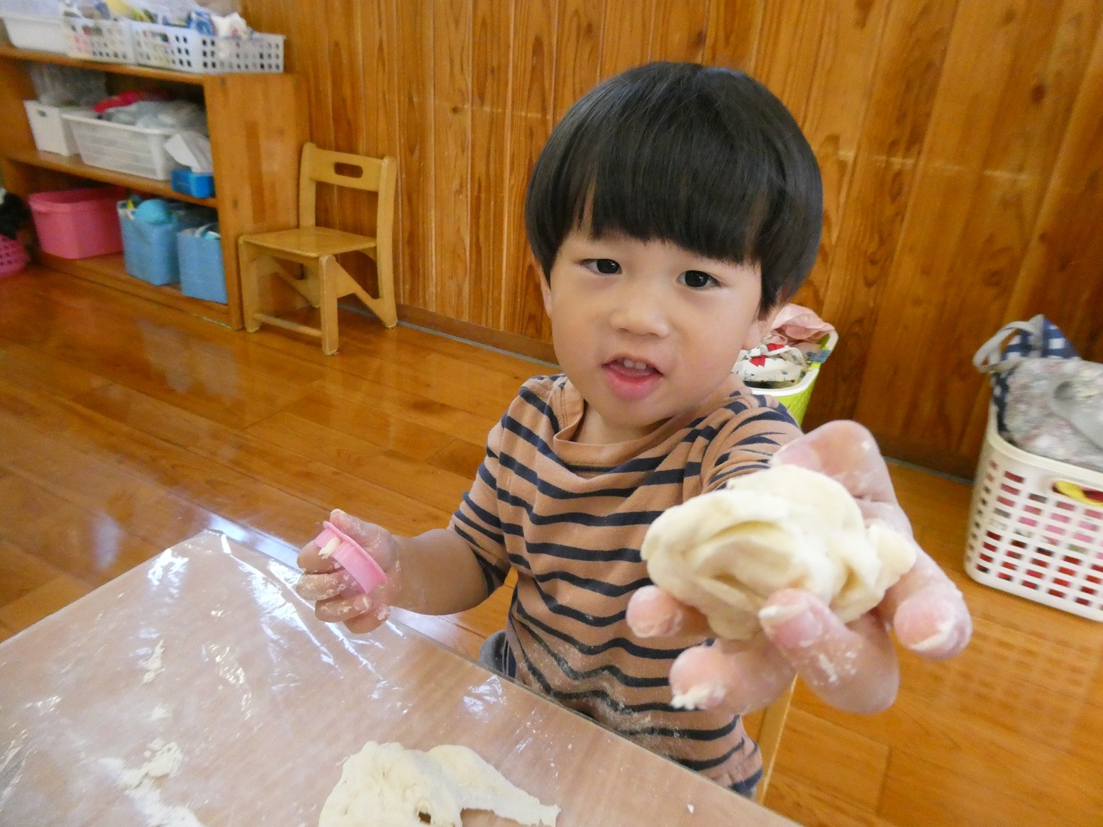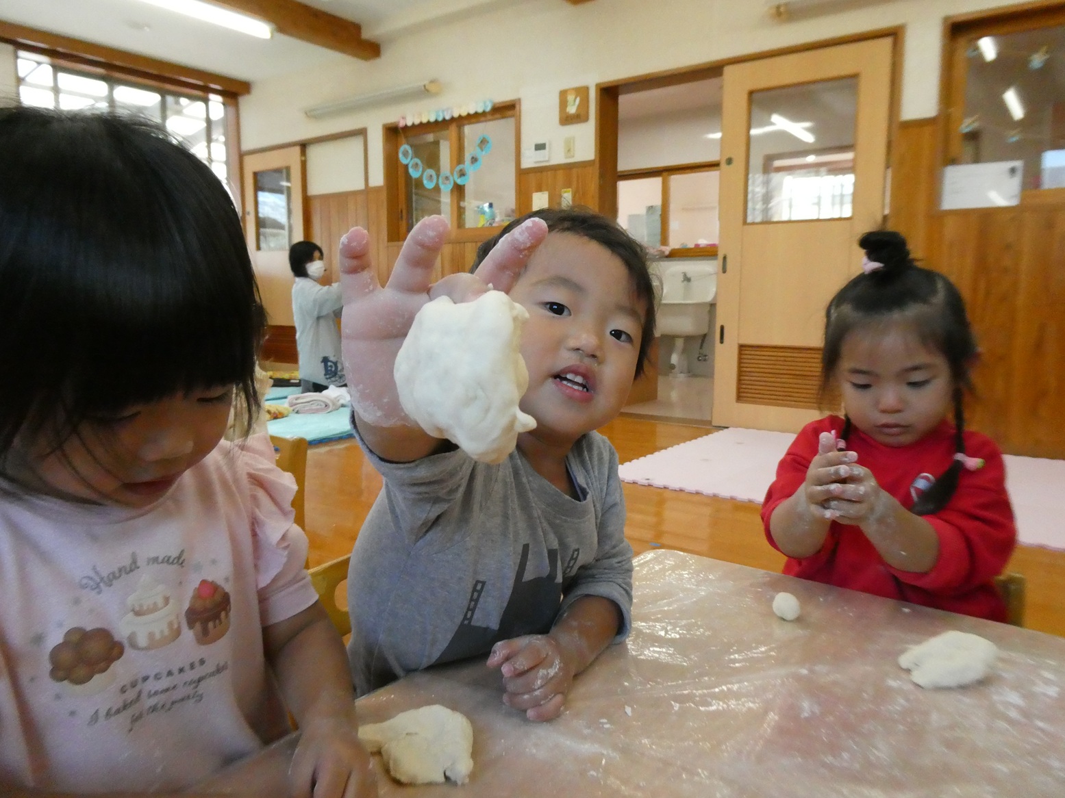 今月のおむすびの日は、小麦粉粘土で遊びました! 小麦粉を触るときから興味津々! みんなでまぜまぜしながら作り、できあがると丸めたり伸ばしたりしながら感触を楽しんでいました!! 型抜きもとっても上手で、夢中になって遊んでいました! そして、大好きなおにぎりもお友だちとお話しながら楽しく食べることができました♡ お忙しい中、ご準備ありがとうございました!