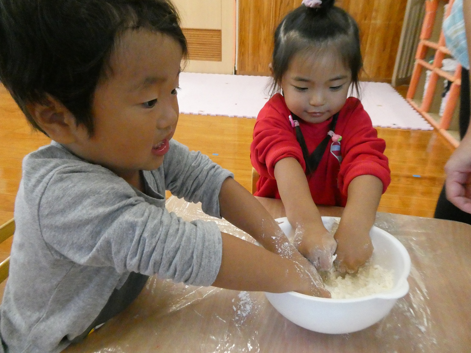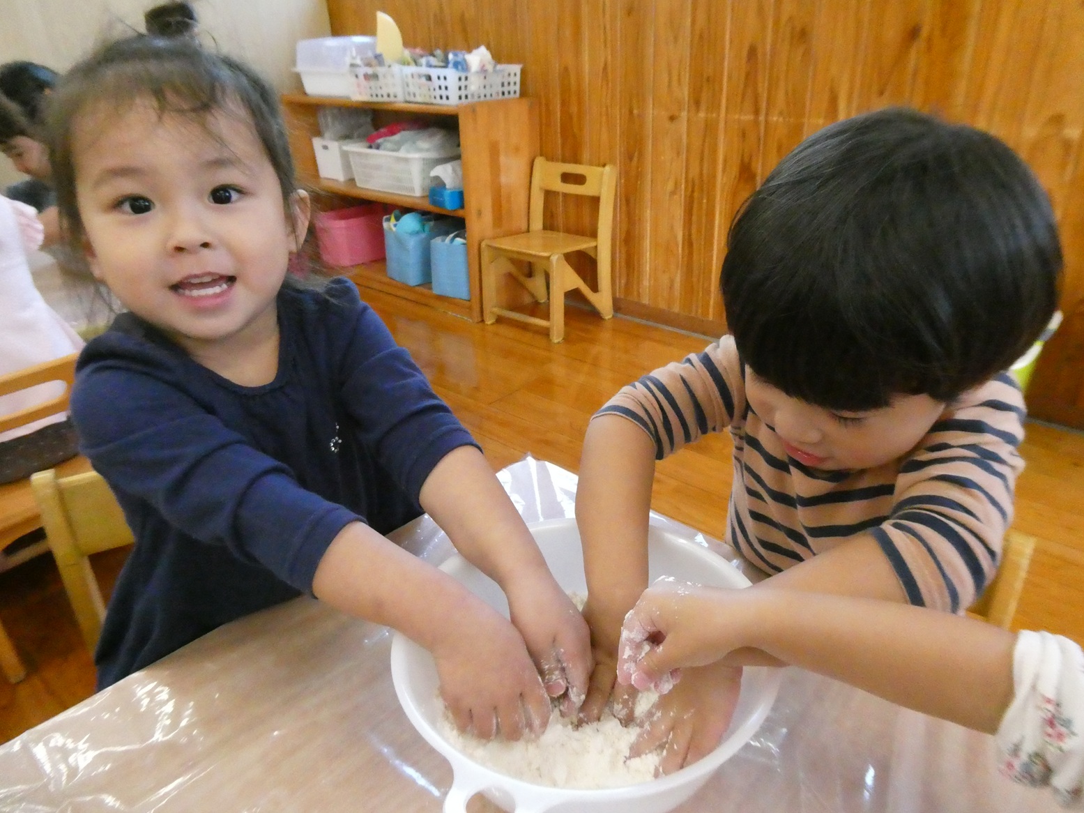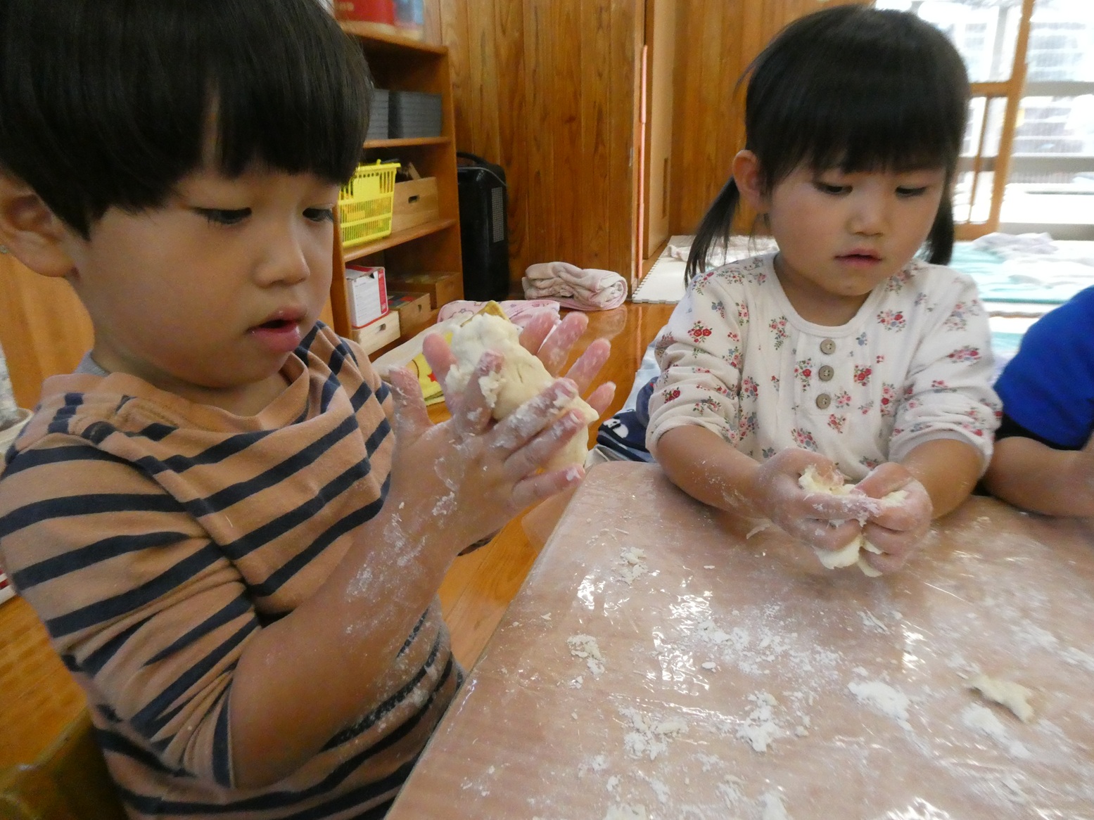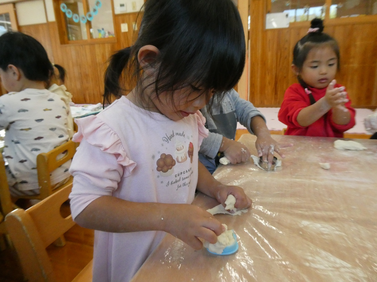 今月のおむすびの日は、小麦粉粘土で遊びました! 小麦粉を触るときから興味津々! みんなでまぜまぜしながら作り、できあがると丸めたり伸ばしたりしながら感触を楽しんでいました!! 型抜きもとっても上手で、夢中になって遊んでいました! そして、大好きなおにぎりもお友だちとお話しながら楽しく食べることができました♡ お忙しい中、ご準備ありがとうございました!