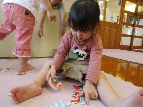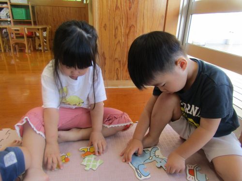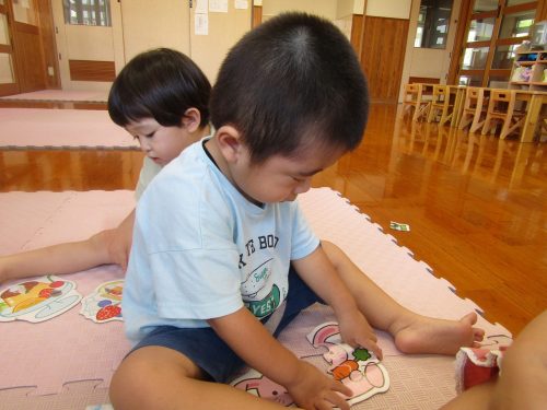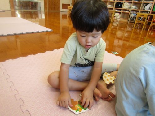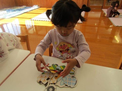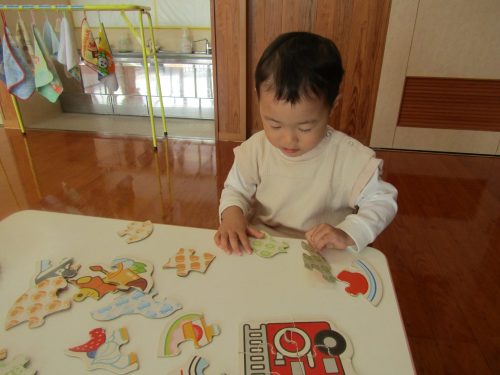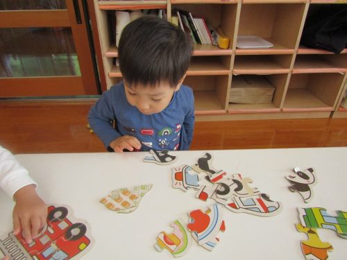 机上遊びでは、パズル遊びを楽しんでいるぱんだ組さん。 動物や消防車など、いろいろな絵のパズルに挑戦しています! ピースを1つずつ手に取り「ここー?」、「あってる?」と考えながら頑張る子どもたち。 完成すると「じゃーん!」と嬉しそうに見せてくれて、達成感いっぱいの様子。 みんなコツを掴み、たくさんのパズルを完成させています。 これからもさまざまな机上遊びを楽しみたいと思います。