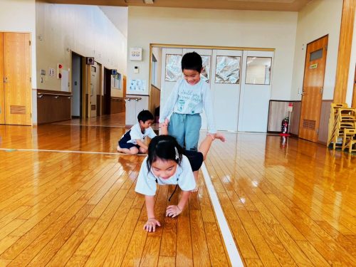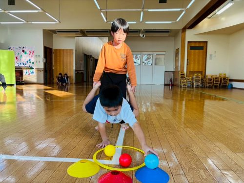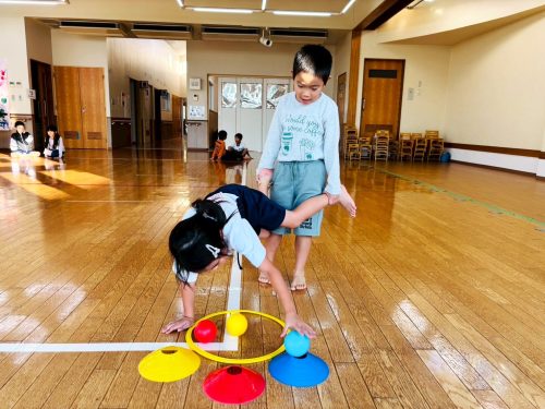 今回は、手押し車を行いました。 2人組でホールの直線を手押し車で進み、折り返し地点で三色のボールを同じ色のコーンの上に乗せていき、先にゴールできたチームが勝ちとなっています! 片手で体重を支えながら、もう一方の手でコーンの上にボールを慎重に乗せていく子どもたち! 体重を支えることが難しく、肘をつく様子も見られましたが、最後まで諦めることなく挑戦する姿が見られました✨ 「相手チームに負けないぞ!頑張ろうね!」とチーム間で声を掛け合い、切磋琢磨しながら笑顔で活動に取り組むことができました♪