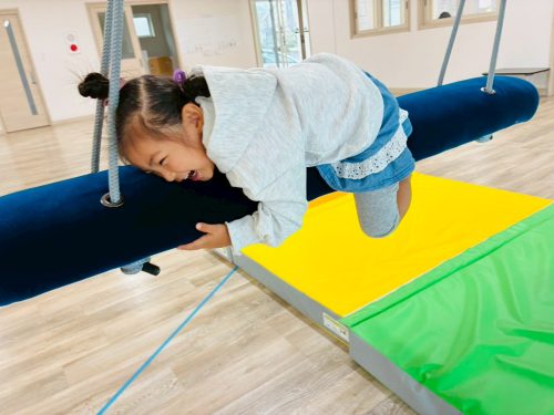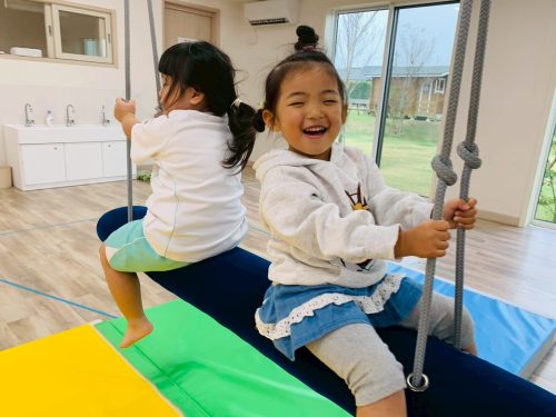 くまグループでは、大型ブランコを行いました。 「今日はブランコ?」と目をキラキラさせる子どもたち! お友だちと一緒に乗ると、楽しさも2倍です☆ 「もっと強く揺らして~!」とのリクエストもあり、大きな揺れにも挑戦しました! ブランコの座位部分に抱きついて、揺れを味わう乗り方も行っています。 最後には、足を曲げ伸ばしして自力で漕ぐこともできましたよ♪
