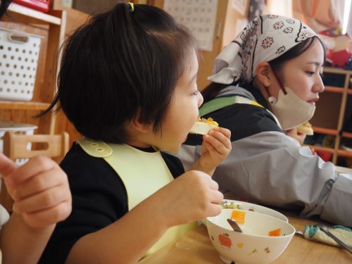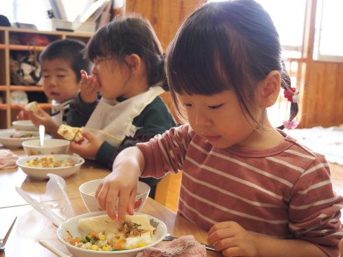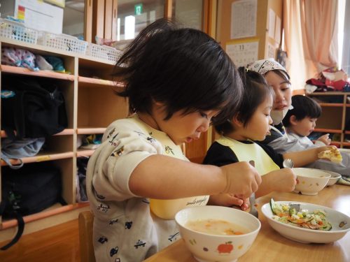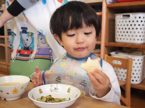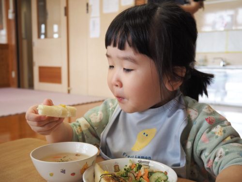 サラダは少し苦手でしたが、デザートを目標に食べ進める姿も見られました。