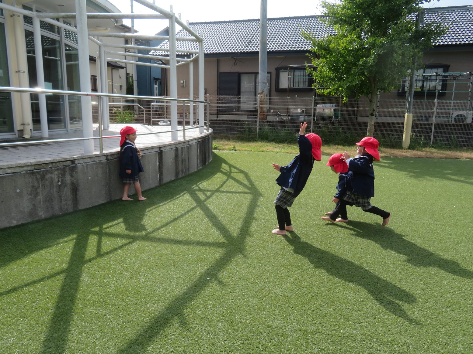 今日は、園庭でだるまさんが転んだをして遊びました。 「だるまさんがころんだ!」と、鬼役の子の掛け声を聞きながら元気に駆け出す子どもたち。 はじめのうちは、鬼役の子が振り返るタイミングで止まることが難しく「○○くん動いた!」と声を掛けられる姿がありましたが、回数を重ねるごとに少しずつ振り返るタイミングで上手にとまれるようになり、中にはポーズを決める子の姿も見られました。 繰り返し行う中で、鬼役の子との駆け引きを楽しむりす組さんです。