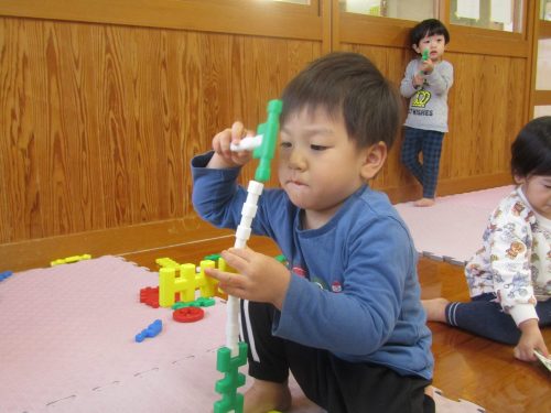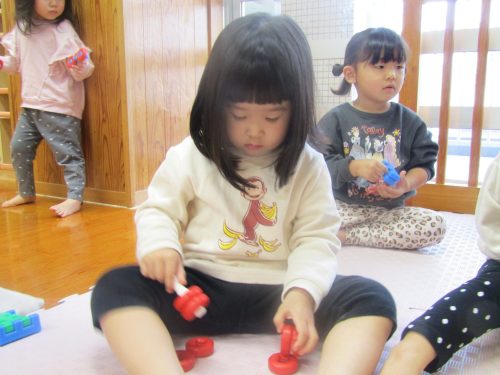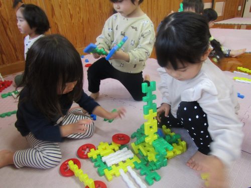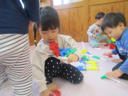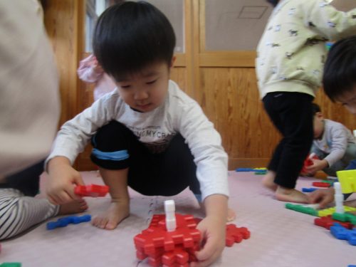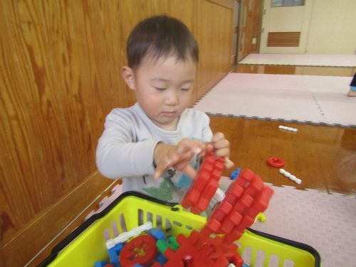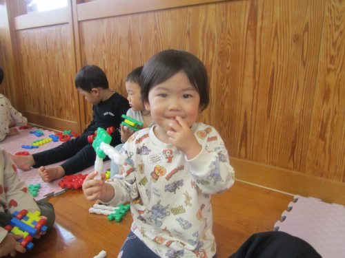 何して遊ぶ?と聞くと「ブロック!」、「これこれ!」とブロックを手に取りニコニコのぱんだ組さん。 丸いブロックを上手に組み合わせて車を作ったり、「ダダンダンだぞー!」と次々といろいろなものを作る子どもたち。 「貸して!」、「どうぞ。」とブロックのやり取りをする姿もたくさん見られるようになってきました。 遊び終わった後は、洋服の上にブロックを乗せて運び、みんなで協力してお片付け! 遊びも片付けも楽しみながら行っていけたらと思います。