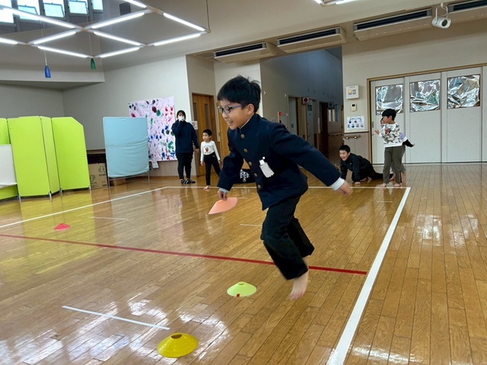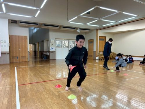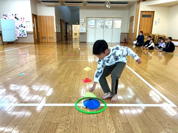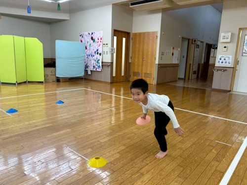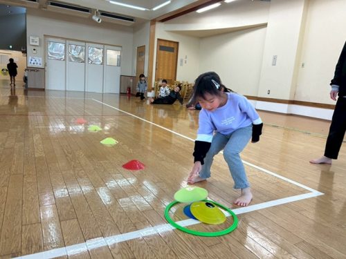 今回は、マーカー集めを行いました。 直線に並べたマーカーを、一つ一つ集めていき、フラフープの中に重ねていく活動になっています。 スピード勝負となっており、1対1でお友だちと競い合い、俊敏にマーカーを集めていきます! チーム戦を行うと、「頑張れ!もう少しだよ!」とお友だちを応援する声が沢山聞こえてきました! 焦りからマーカーが輪っかの中から飛び出たり、バラバラに重なったりすることもありましたが、丁寧にマーカーを重ねなおし、真剣な表情で最後まで諦めずに取り組む子どもたちでしたよ♪