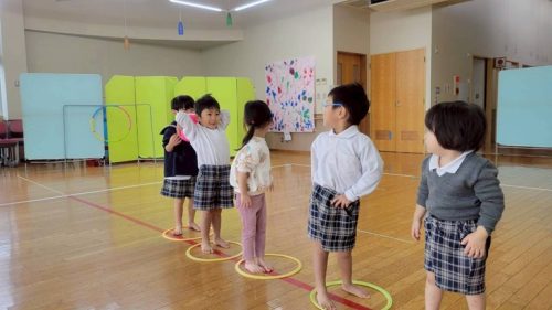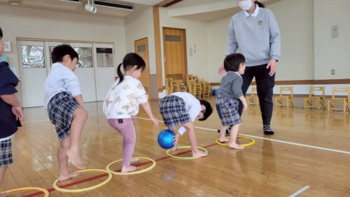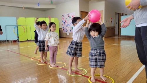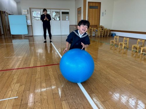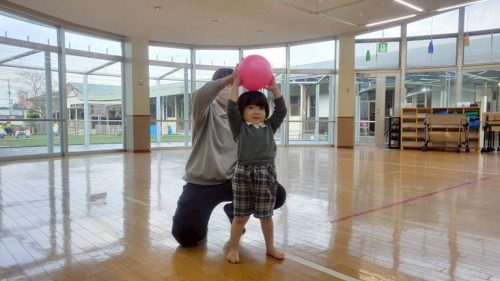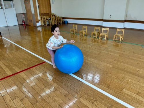 今日は、ピラティスボールをいろいろな体勢で渡す活動をしました。 青いボールは股の下、ピンクは頭の上、黄色は身体の左右を通してボール渡しに挑戦! ボールの色を確認して、身体を前後左右に動かしながらボールを渡す子どもたち。 最後は、職員の、「はいっ!どうぞ!」の声掛けに合わせて、ボール渡しリレーや大玉転がし競争にも取り組みました。 ボールが最後の人まで渡ると、笑顔いっぱい喜ぶくまグループさんでしたよ☆