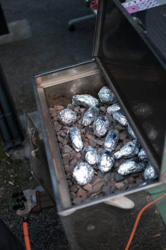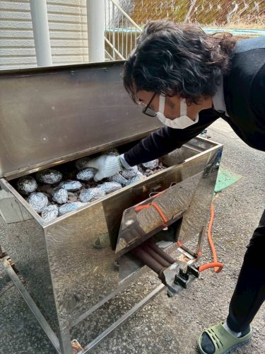 一人ずつ、お芋巻いたアルミに名前を書いて石焼き窯へ!