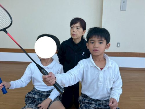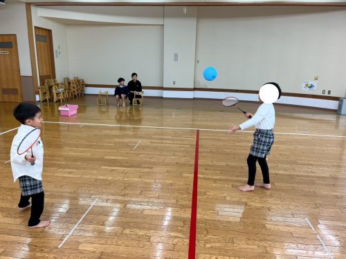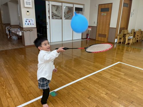 今回、ぞうグループさんはバドミントンを行いました。 初めての活動だったため、ラケットの持ち方の確認をし、シャトルの代わりに風船で取り組んでいます。 活動の最初は、風船が落ちないようにラケットで上に打つ練習をしました。 始めは、ガット以外の部分で打つ様子が見られましたが、慣れてくるとガットの部分で打つことができています。 最後には、職員やお友だちとラリーに挑戦です! 何度も挑戦するうちに距離感や風船の落下地点を把握し、10回以上ラリーを成功させることができたぞうグループさんでした♪
