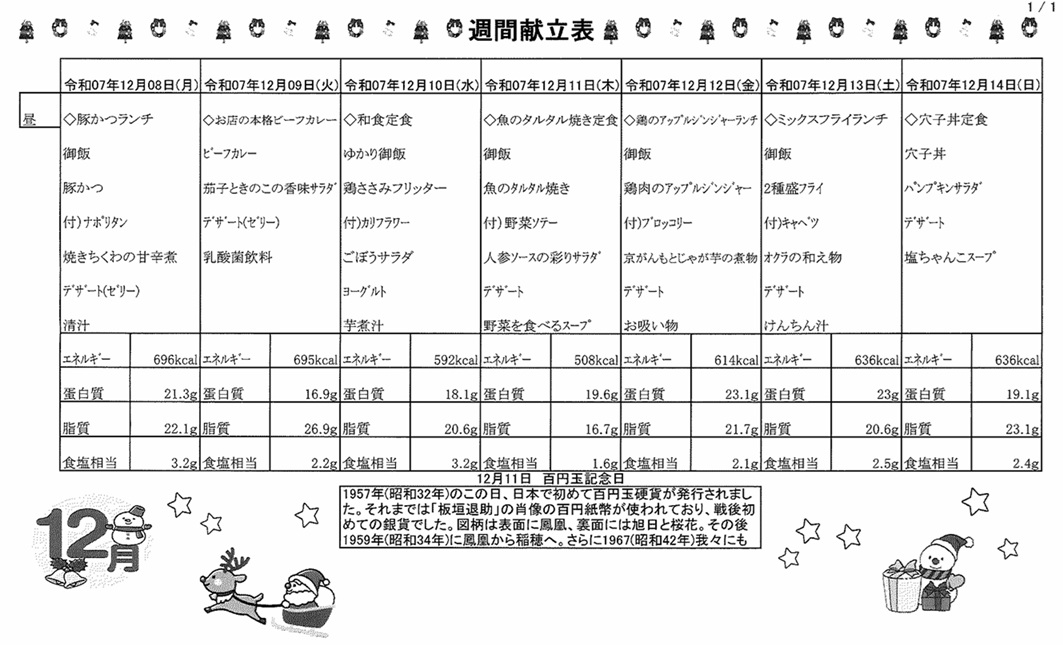 12月8日(月)~12月14日(日)の献立表になります。ぜひご覧ください。