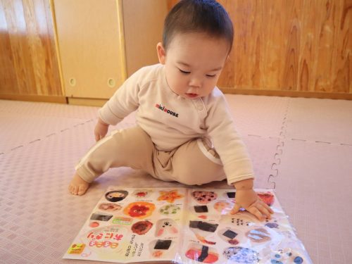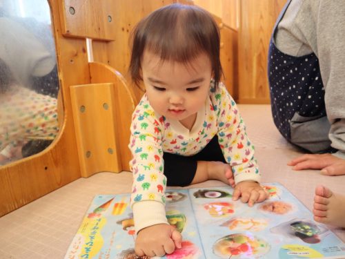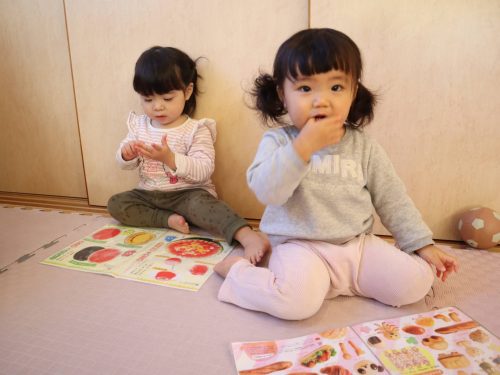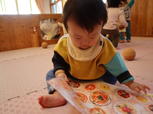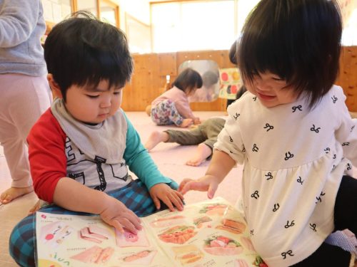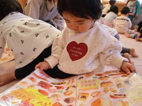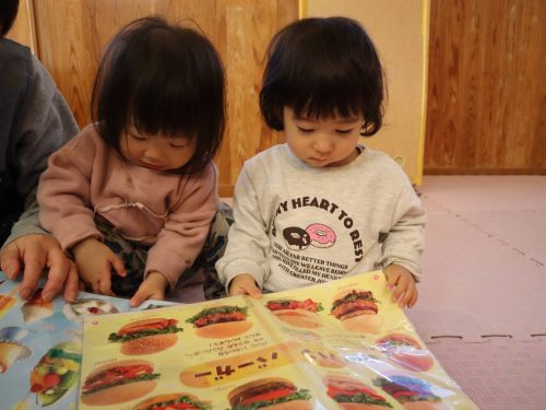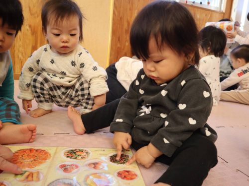 絵本の食べ物のページをコピーすると、みんなでワイワイ眺める姿が見られました。 好きな食べ物を指差し、「あ!」と食べたい物を教えてくれます。 おにぎりやピザ、スープ、ハンバーガー、ケーキ等、美味しそうな料理に夢中の子どもたち! 時々指でつまんで「ぱくっ」と口に運ぶ仕草も可愛らしいです。 色んな食べ物や料理に興味を持って、何でも食べられますように!
