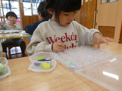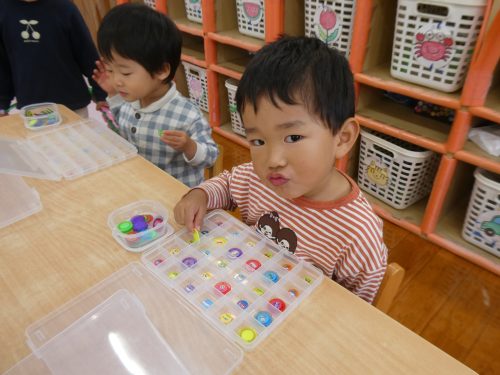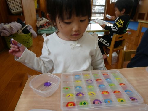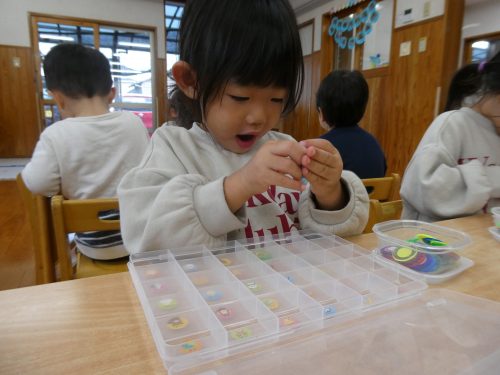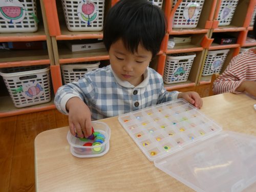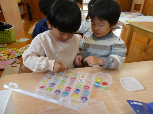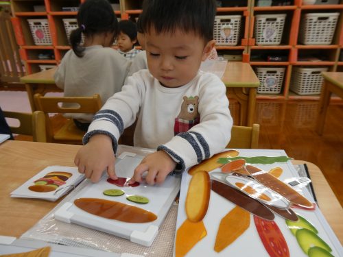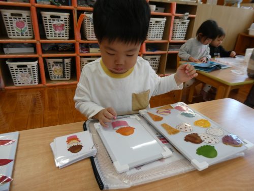 最近、机上遊びで上手に遊べるようになってきているぱんだぐみさん! 同じシールを見つける遊びや イラストに合わせて、お寿司やアイス、ハンバーガーを作る遊びに夢中です☆ 真剣な表情で取り組む子やできると嬉しそうに教えてくれる子、苦戦しながら頑張る子・・・ と子どもたちの色んな表情が見られます。 お友だちと協力して遊ぶ姿も見られるようになってきました! これからも色んな机上遊びを取り入れながら過ごしていきたいと思います!!