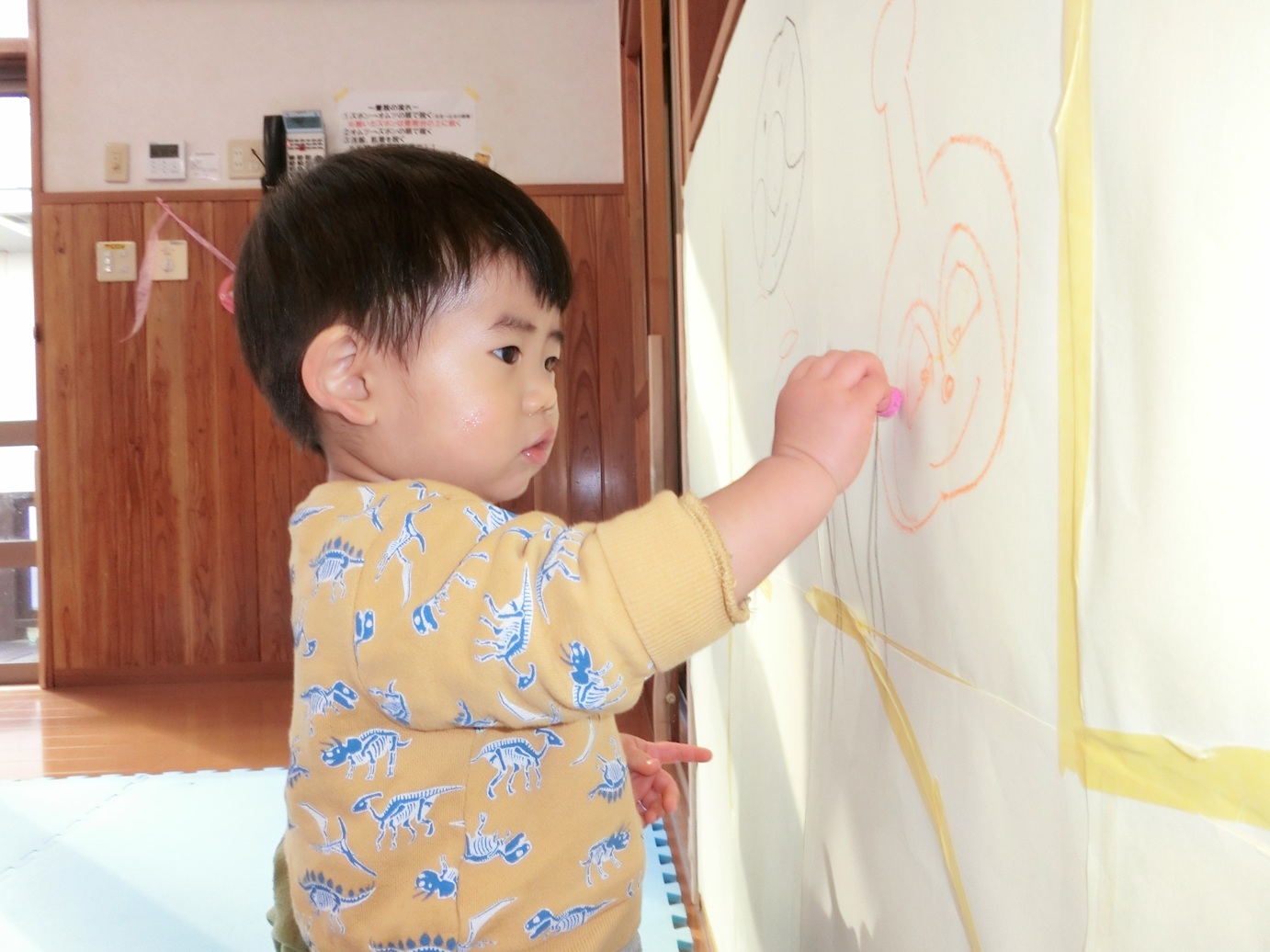 好きな色のクレヨンを持って壁に絵を描くことを楽しんでいきます。