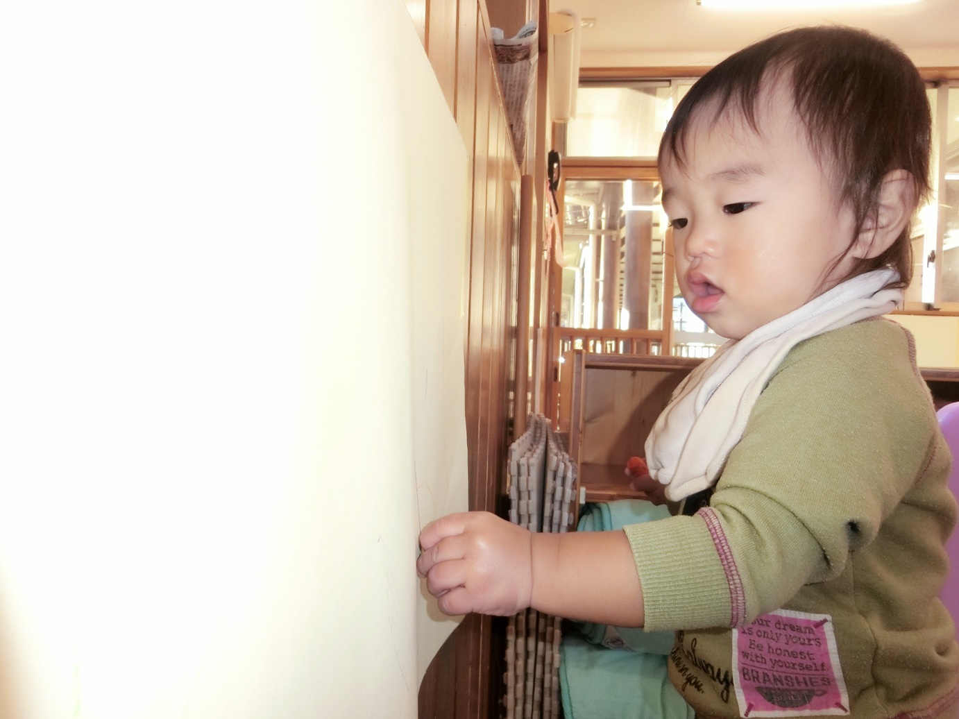 好きな色のクレヨンを持って壁に絵を描くことを楽しんでいきます。
