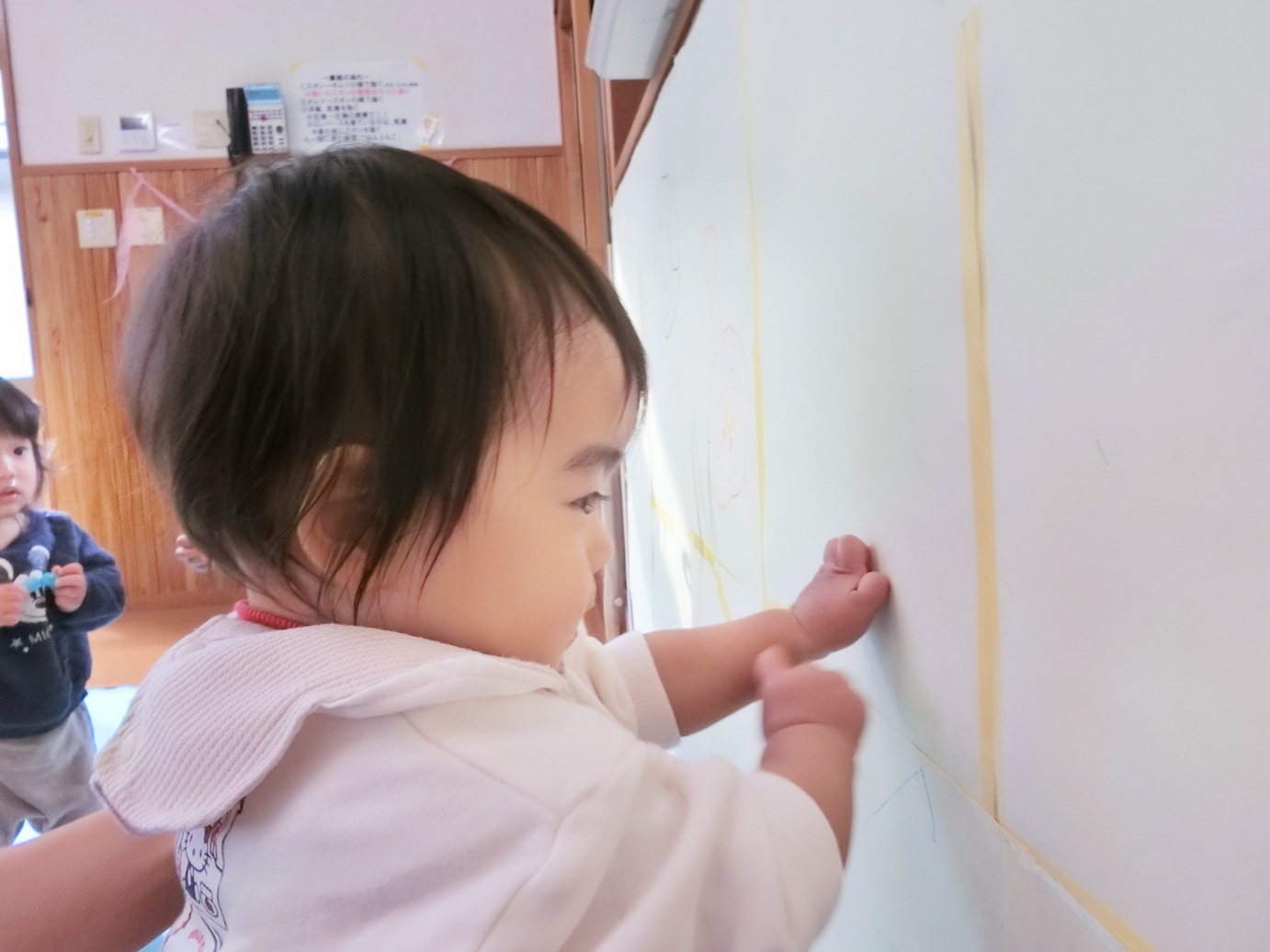 クレヨンを持つのも上手になり、ぐるぐると丸を書くなど殴り書きを楽しんでいるひよこ組さん。