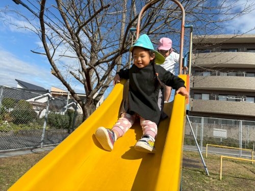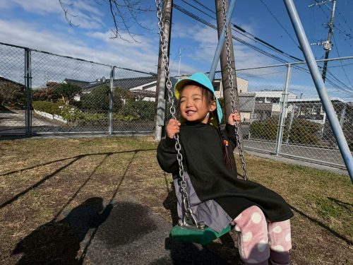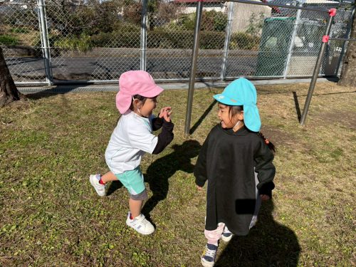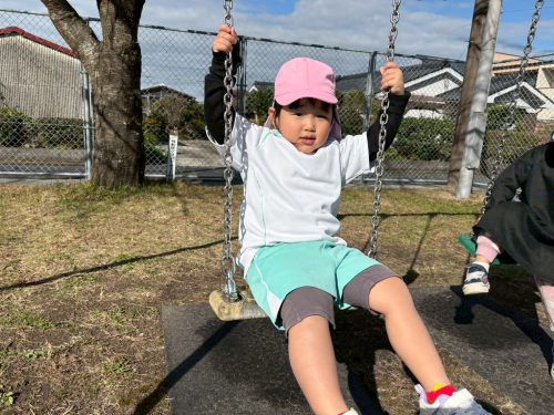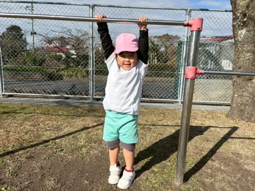 戸外活動に行きました♪ 少しずつ寒くなっていることで見慣れた公園の変化に気付いたようで、「はっぱさんいないね~。」「ブランコつめた~い!」とお話してくれました! ブランコでは足の曲げ伸ばしを練習中です。 職員の掛け声に合わせて、「キック、曲げる!」と挑戦することができましたよ! お友だちと鉄棒のぶら下がり競争をしたり、滑り台を一緒に座ったりと笑顔あふれるお外遊びでした☆
