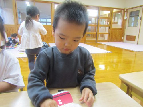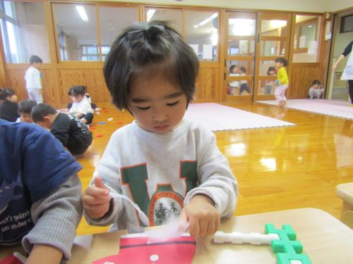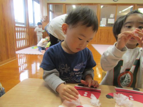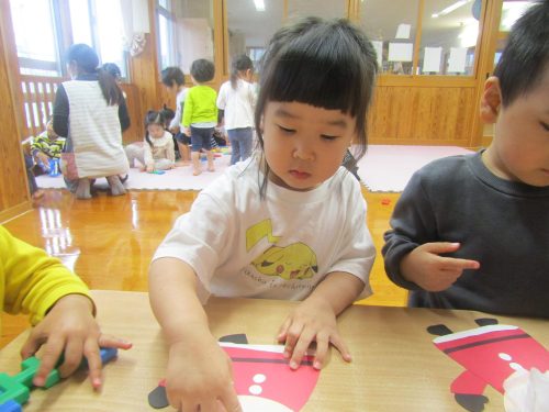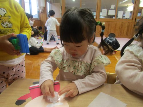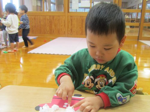 12月の製作はサンタさんづくりをしました。 製作が大好きなぱんだ組さん。「僕は―?」、「したい!」とやる気満々! 花紙を小さく丸めてペタン!と貼るとサンタさんのおひげに。 友達が作っている様子を見て、順番を楽しみに待つ姿もあります。 最後に指スタンプでほっぺを付けて完成。 部屋に飾ると見つけて「サンタさん!」と嬉しそうな子どもたちでした。