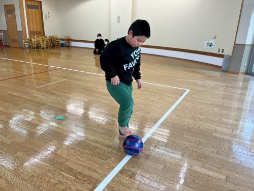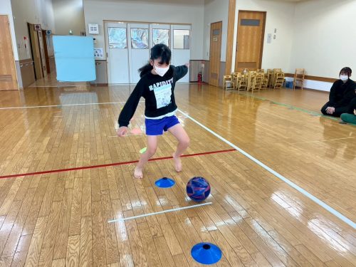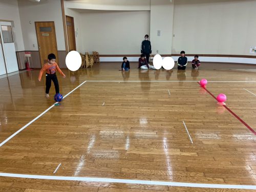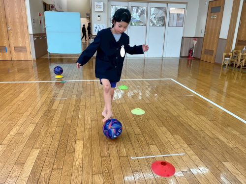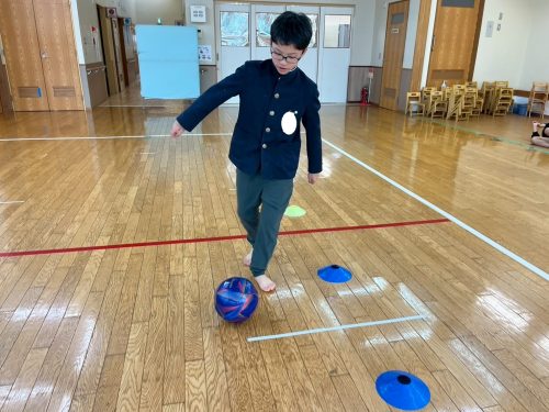 勢いよく蹴ると、ボールが足場から離れて転がるため、初めは、「難しい。」と声に出す子どもたちでしたが、徐々に力加減を意識しながら慎重に進む様子が見られました☆