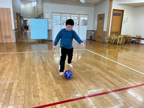 今回は、雨天のため、ホールでサッカーのドリブルに挑戦しました!