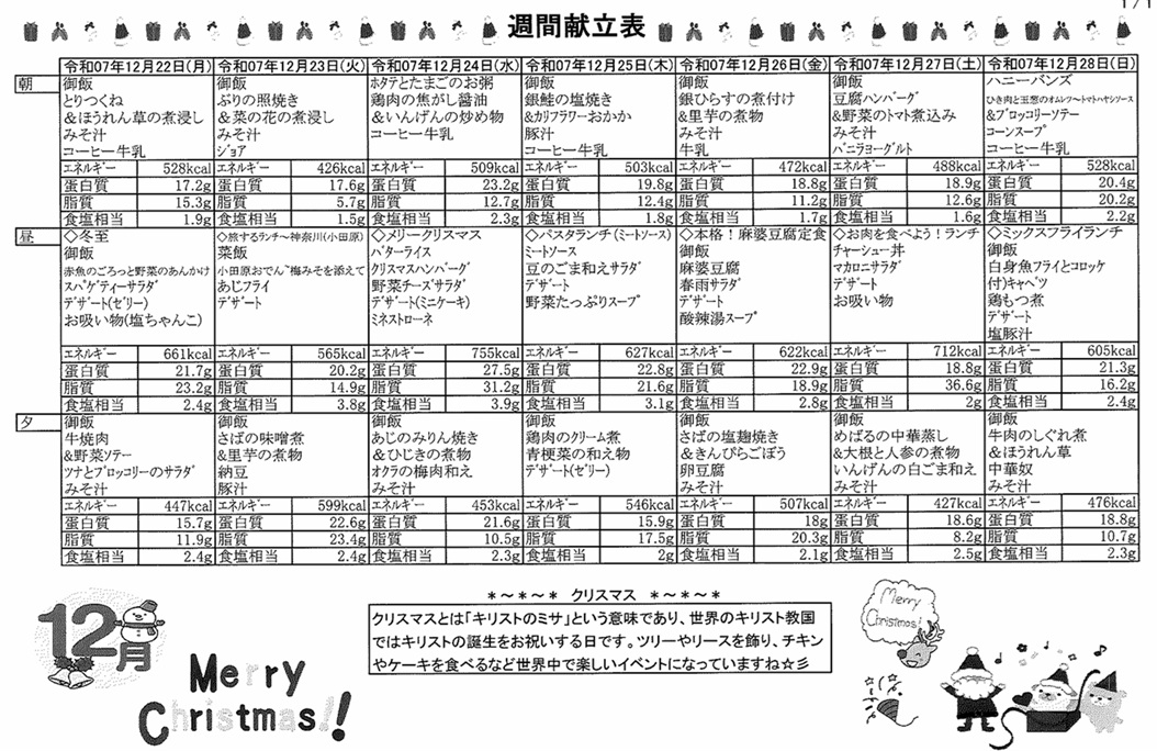 12月22日(月)~12月28日(日)の献立表になります。ぜひご覧ください。