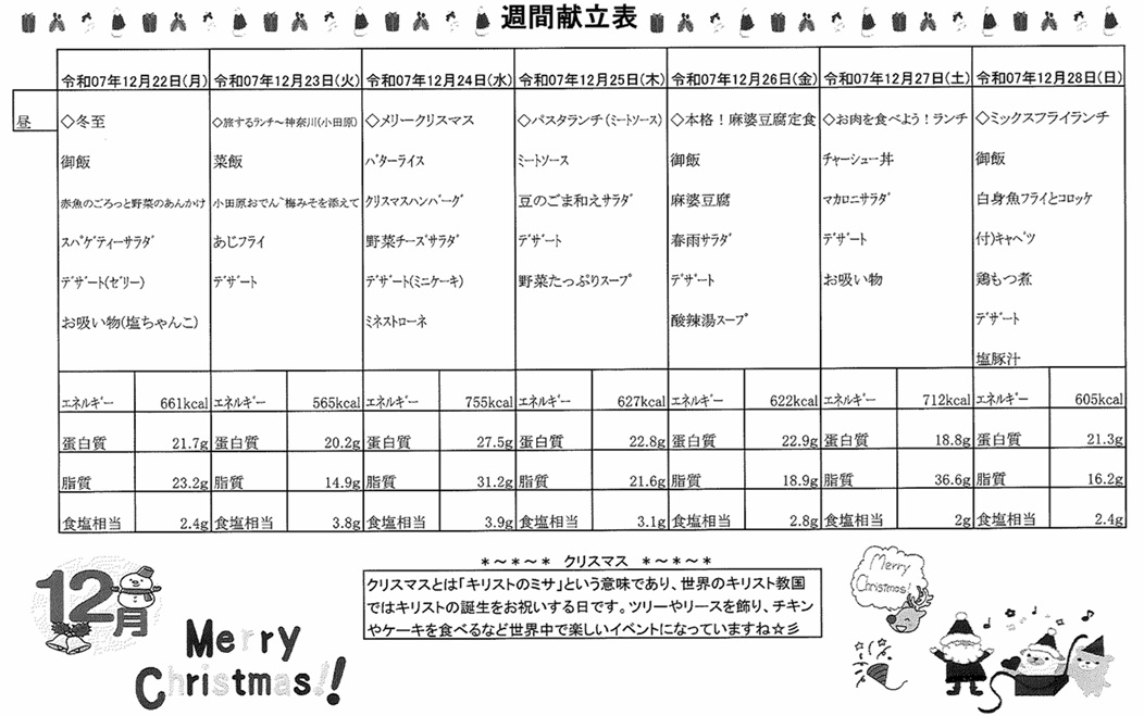12月22日(月)~12月28日(日)の献立表になります。ぜひご覧ください。