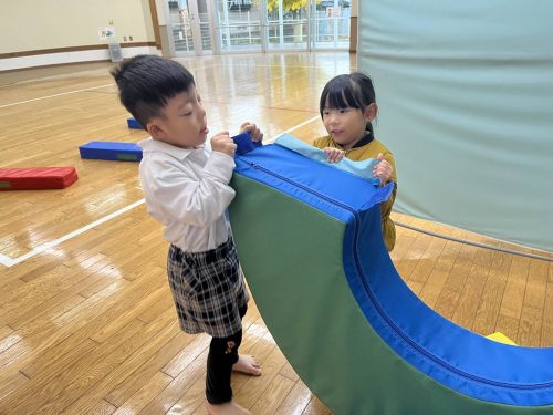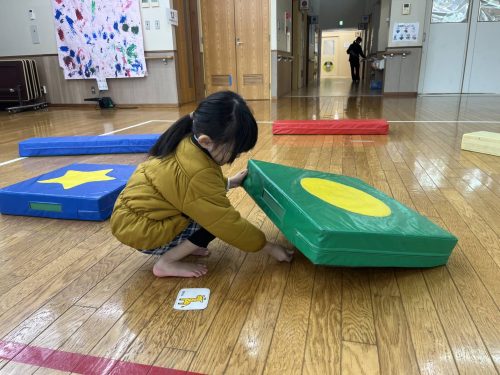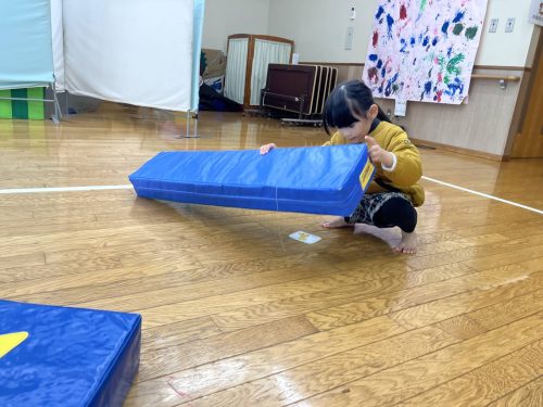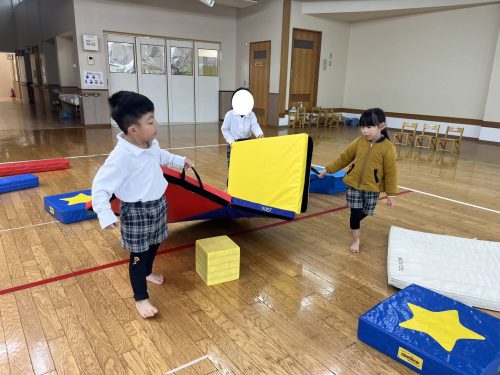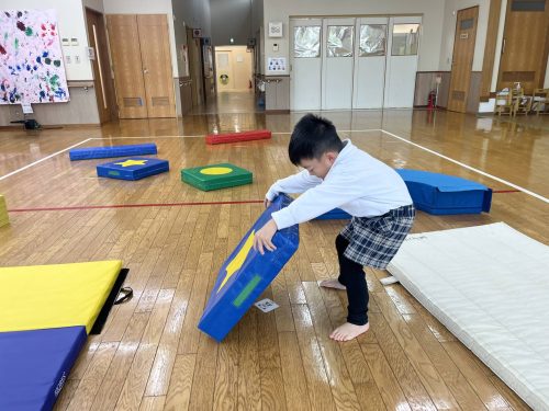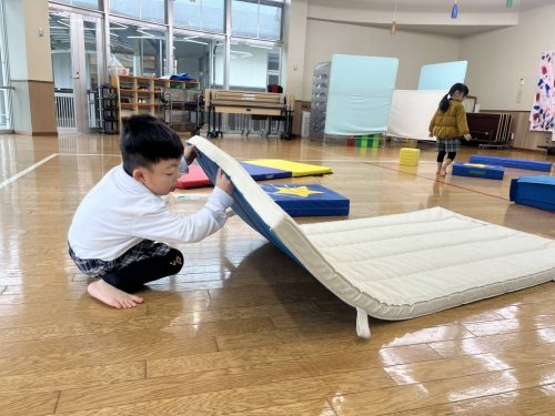 まずは、ホールにJPマットや白マット、ソフトブロック等をお友だちと協力して運んでもらいます。