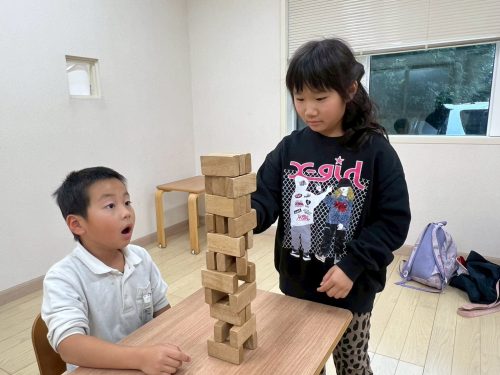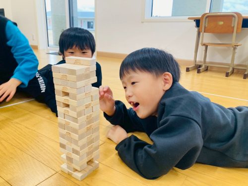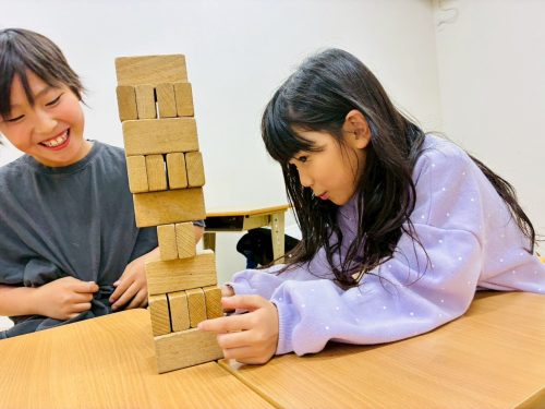 タワーが倒れないよう、慎重にジェンガを見極めながら選ぶ子どもたち…。
