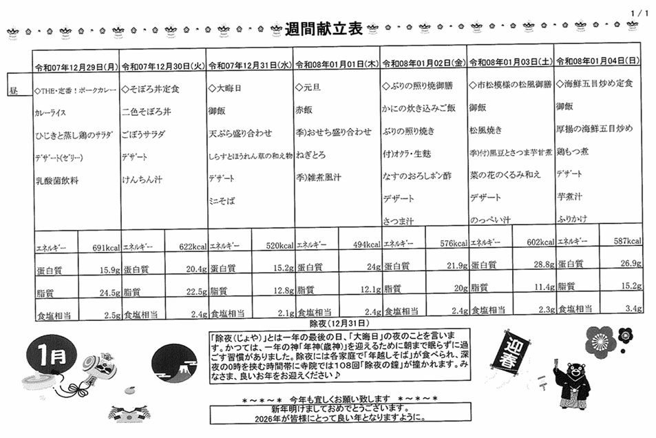12月29日(月)~1月4日(日)の献立表になります。ぜひご覧ください。