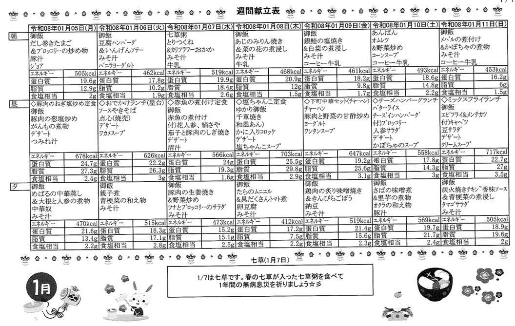 1月5日(月)~1月11日(日)の献立表になります。ぜひご覧ください。