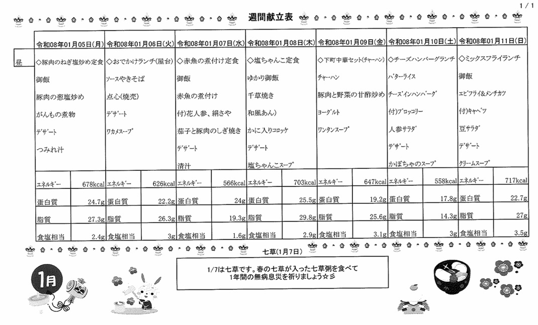 1月5日(月)~1月11日(日)の献立表になります。ぜひご覧ください。