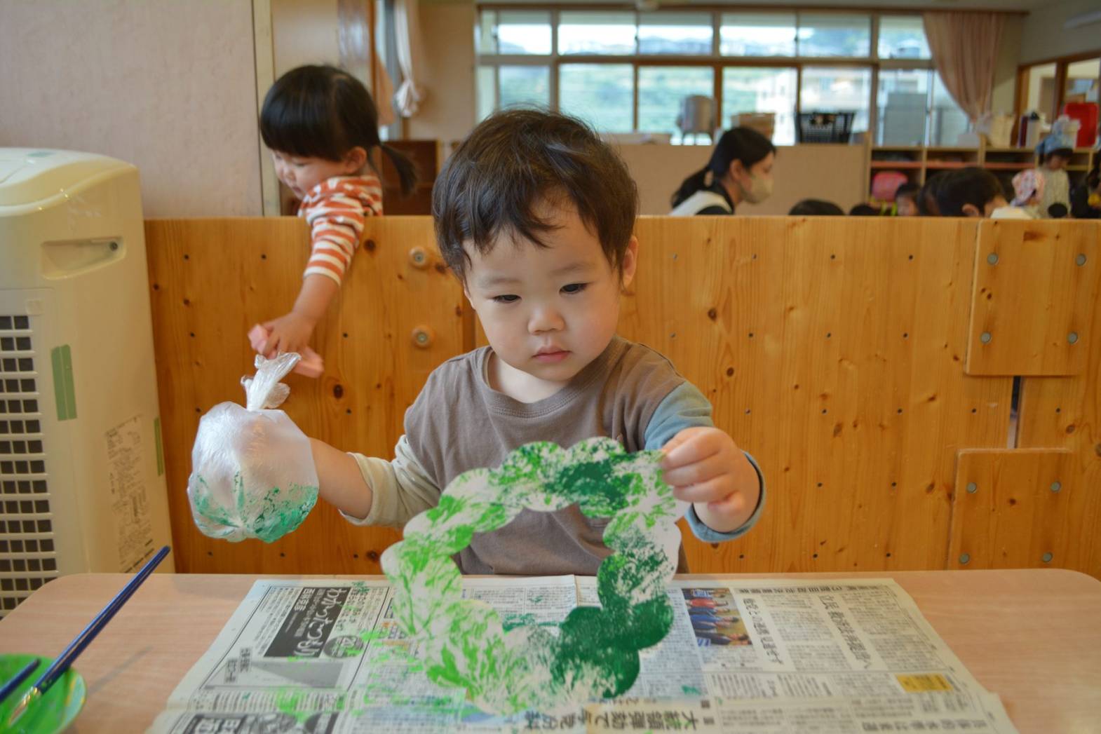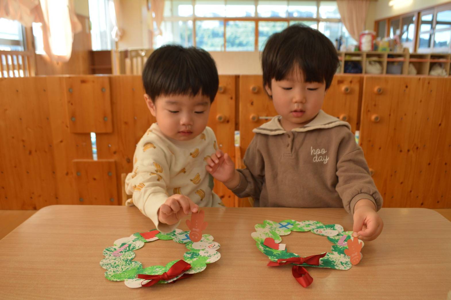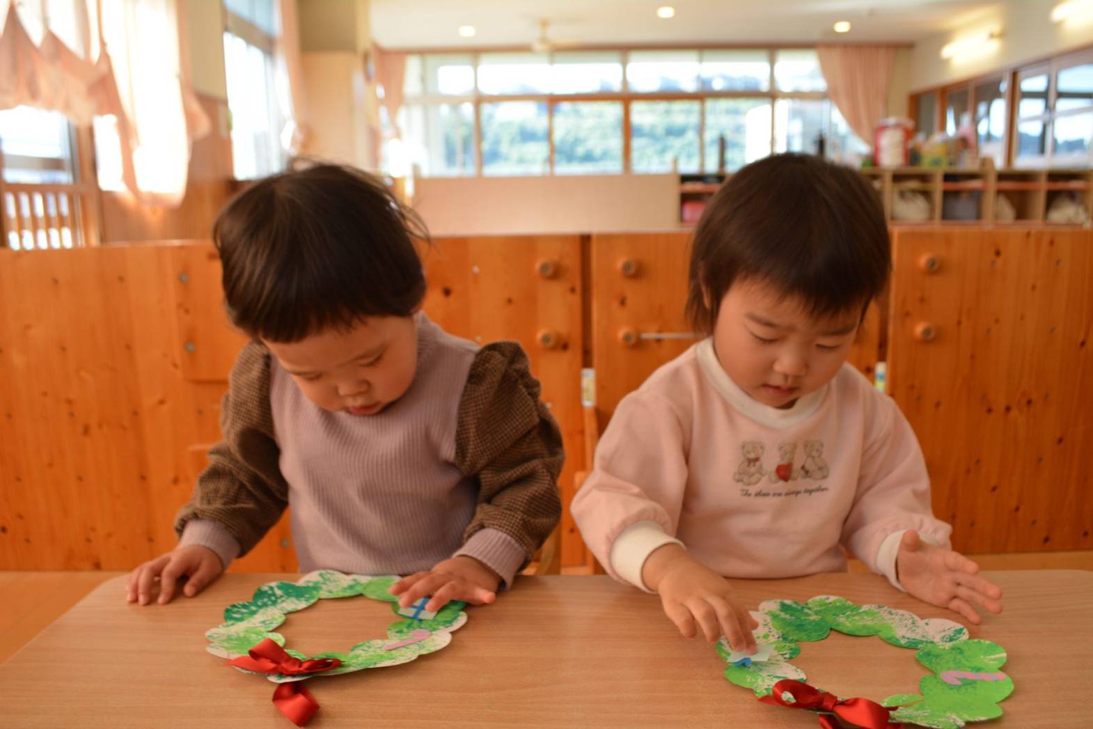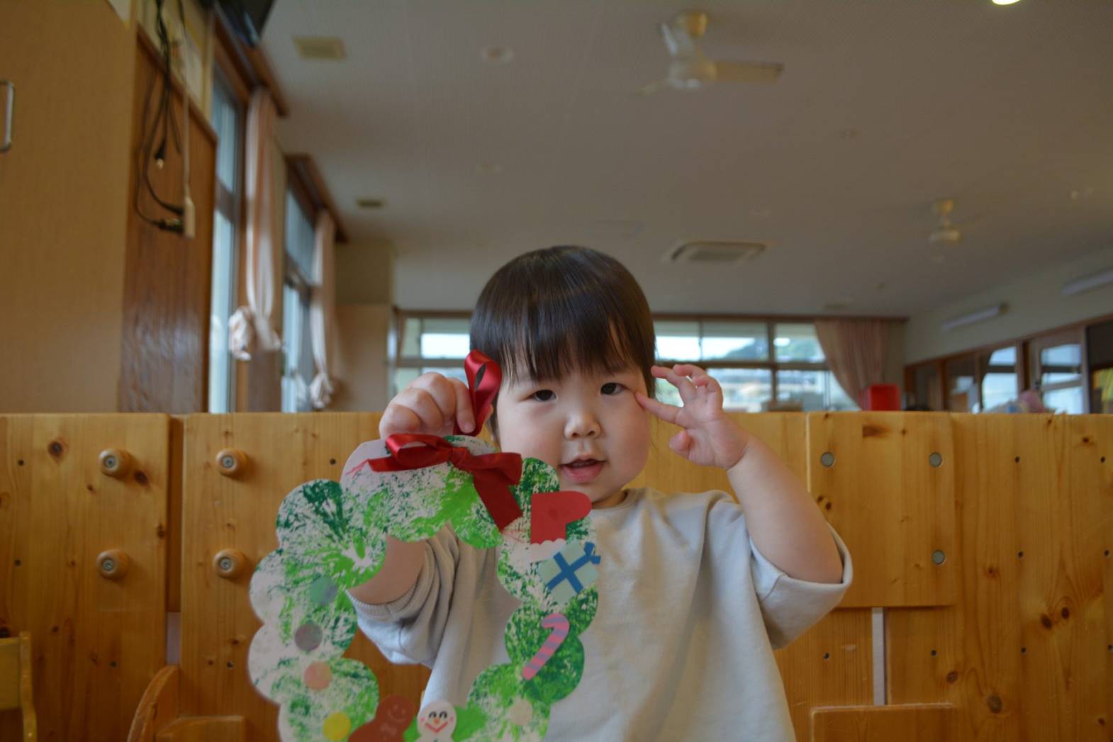 こあら組では、クリスマスに向けてリース作りをしました。 袋を使い、真っ白なリースに黄緑色や緑色の絵の具で色を付けていく子どもたち。 色が付くと、「お花みたい!」、「花火みたい!」と目を見開いて言葉にする姿が見られました。 色を付けた後は、オーナメントを貼りかわいいリースが完成して嬉しそうなこあら組さん。 是非お家で飾ってみて下さい!