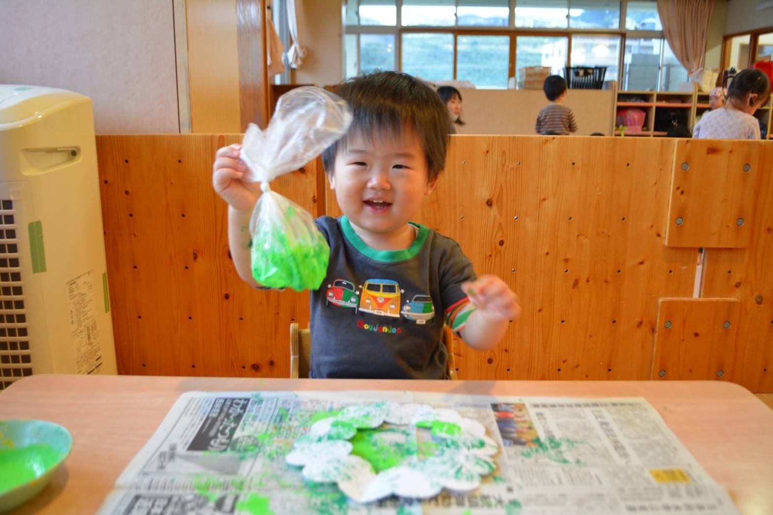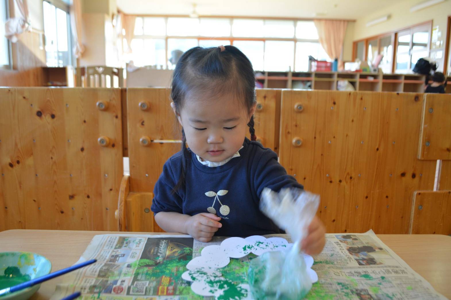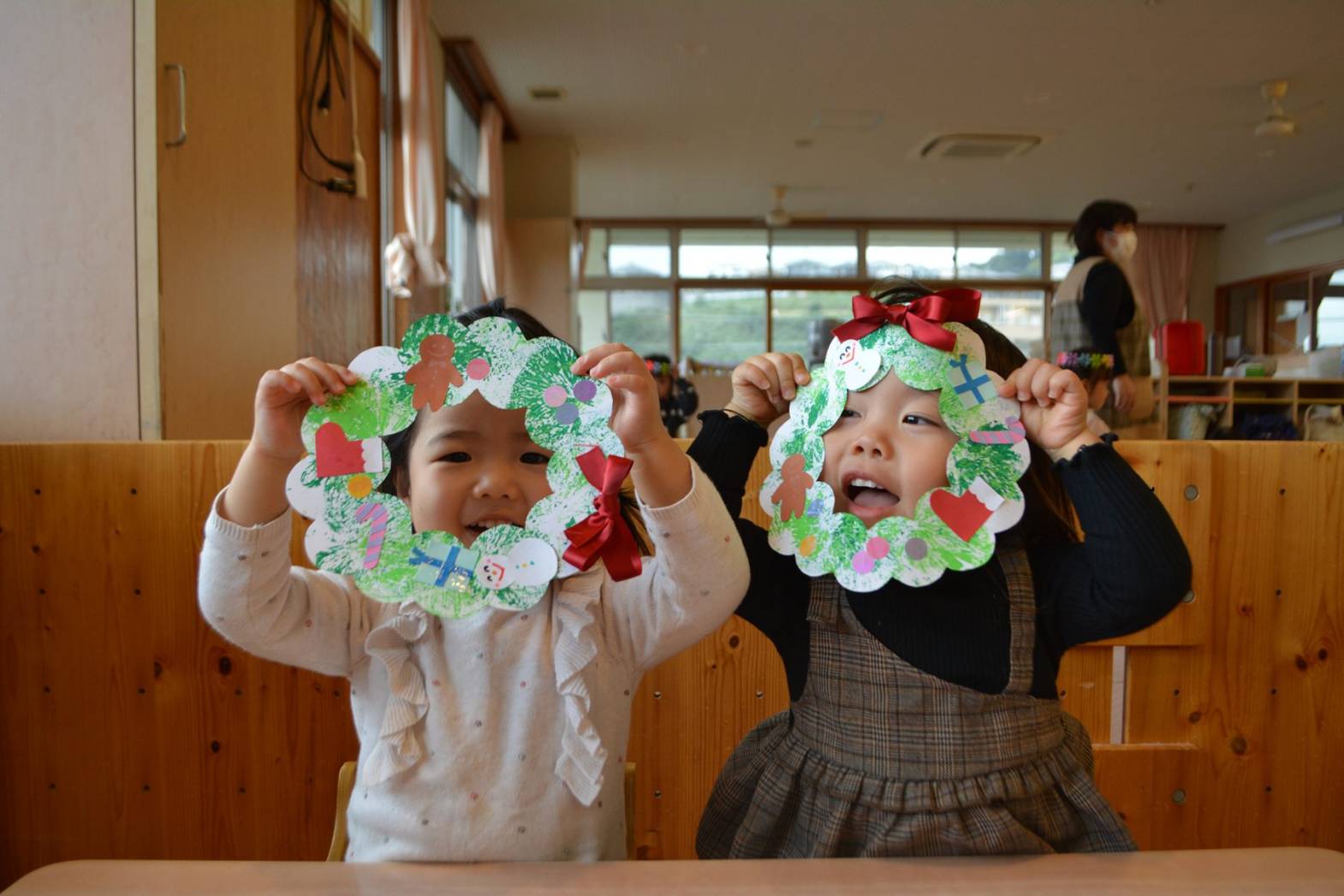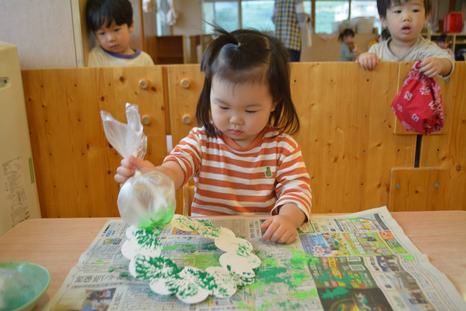 こあら組では、クリスマスに向けてリース作りをしました。 袋を使い、真っ白なリースに黄緑色や緑色の絵の具で色を付けていく子どもたち。 色が付くと、「お花みたい!」、「花火みたい!」と目を見開いて言葉にする姿が見られました。 色を付けた後は、オーナメントを貼りかわいいリースが完成して嬉しそうなこあら組さん。 是非お家で飾ってみて下さい!