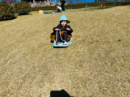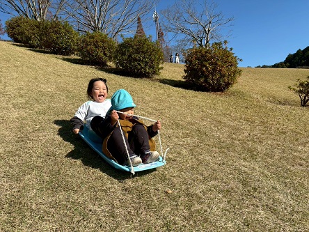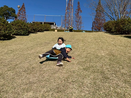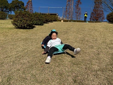 戸外活動でふれあいスポーツランドに行き、草そりを行いました! 急勾配な坂を見て、「高~い!怖い!」との声が聞かれ、ドキドキしながら滑る準備をする子どもたち。 そりの紐を握り、背中を伸ばして勢いよく滑ることができましたよ☆ 滑り終わるとニコニコ笑顔で、「もう一回する~!」と坂を登る姿がありました。 二人乗りにも取り組み、バランスを崩さないようお友だちと協力しながら滑る様子が見られました! 草まみれになりながらも、全力で楽しむくまグループさんでした♪