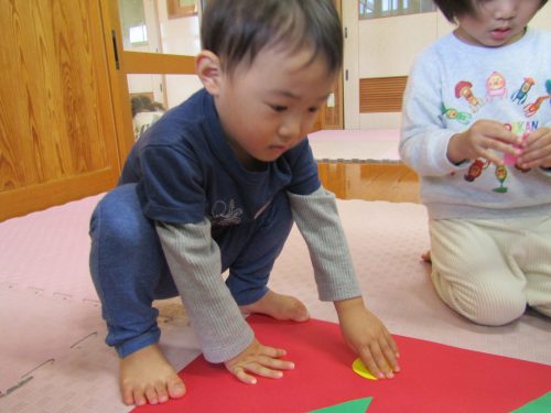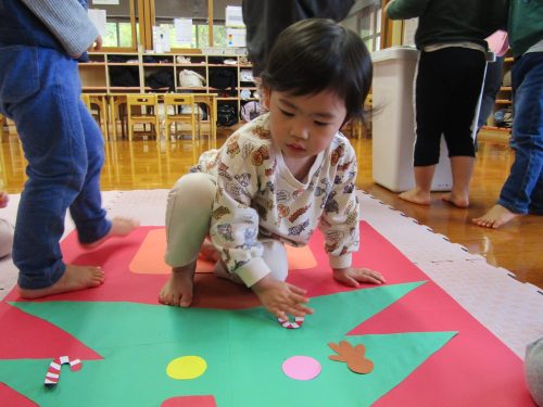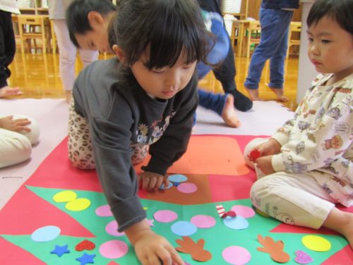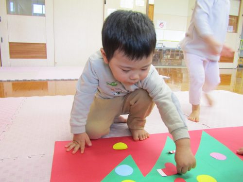 数日前から「クリスマスだね!」、「サンタさん来るかな?」とクリスマスを楽しみにしているぱんだ組さん。 大きなクリスマスツリーにみんなで飾りつけをしました。 ツリーを見ると「わーー!!」、「すごいね!」とワクワクした様子。 1つずつ上手に飾りつけをし、「ここだよ!」と子どもたち同士で話しながら飾りつけを楽しみました。 完成したクリスマスツリーにを見てニコニコの子どもたち。 ぱんだ組さんでクリスマスパーティーもしたいと思います!