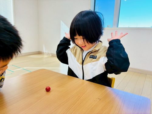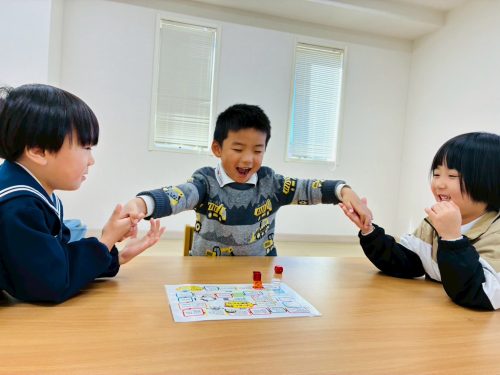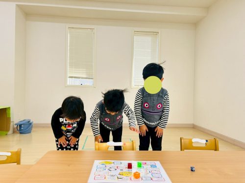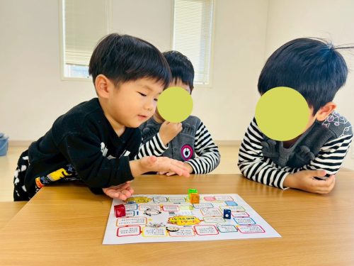 とら・ぞうグループですごろくの活動を行いました♪ サイコロに書かれた数字や目の数を正しく読めるようになってきた子どもたち。 サイコロを振るとドキドキした表情で数を数える様子が見られました。 今回行ったファミリーすごろくは、マスに書かれたお題に応えながら進みます。 お友だちと一緒に取り組む課題は大盛り上がり! みんなと握手したり、一緒にお辞儀したりと協力して取り組む姿が見られましたよ。 全員がゴールするまでお友達を応援する優しい子どもたちでした☆